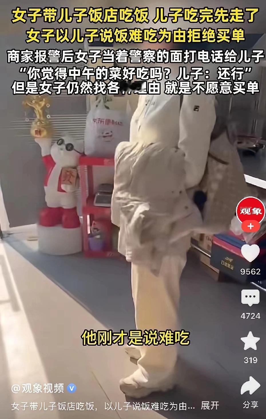 奇葩至极! 刚刚看到一个事发福建三明市的视频,内容是这样的:一位来自山东的女子带着儿子到一家饭馆吃饭,吃完饭儿子有事先行离开了,随后该女子以儿子说“饭难吃”为由,拒绝买单。无奈店主打电话报警,警察来了后,该女子当着警察的面给儿子打电话,问“你觉得中午的菜好吃吗?”儿子回答“还行”,该女子又改口说儿子当时吃的时候说难吃…… 警察来了,她依然如此,还要求店主给她打包,要到相关部门对菜品进行鉴定,滑稽到家了吧! 警察问是不是没有钱了?她还给警察看她的微信钱包,说还有800多块钱,就是因为“饭难吃”而拒绝付款…… 真是奇葩至极哈!希望当地公安部门,对这些无赖者严格依法处理……