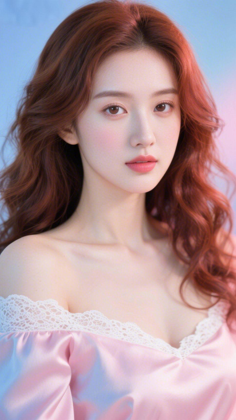 绯发静 淡蓝粉晕的背景里,她发梢的绯色像揉了晚霞的温软。衣间的蕾丝轻垂,衬着肩畔的舒展,都浸着平和的静意。 唇上的柔色与发间的绯轻融,像把最软的一缕云,收在了这一帧里。没有刻意的修饰,只是自然舒展着,便让发梢的暖与衣料的柔,织成了时光里妥帖的画面——是绯发裹着的温和,是蕾丝栖着的轻,是不经意间漫开的松弛与宁和。 绯发温静 柔衣轻帧