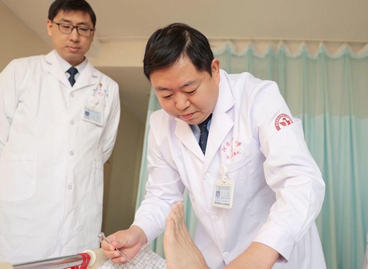 2024年,科室此前接诊一位91岁高龄腰椎间盘突出症患者。老人有9年心脏病史,心功能分级较差,合并冠心病、心梗、心衰等基础疾病,受腰椎间盘突出症困扰8年,就诊时右下肢剧痛麻木,已无法站立行走。检查显示,患者腰2/3节段有巨大椎间盘脱出,部分髓核钙化游离,手术风险极高。邵锋组建诊疗小组,联合相关科室多次会诊,最终确定局部麻醉下椎间孔镜下髓核摘除+椎管扩大减压术。手术中,邵锋凭借精湛技术精准穿刺、精细操作,避开脊神经,彻底清除病变髓核并妥善止血。术后患者右下肢疼痛即刻消失,24小时后麻木感消退,可佩戴腰围拄拐稳健行走。该案例成为微创技术救治高龄重症患者的经典范本。