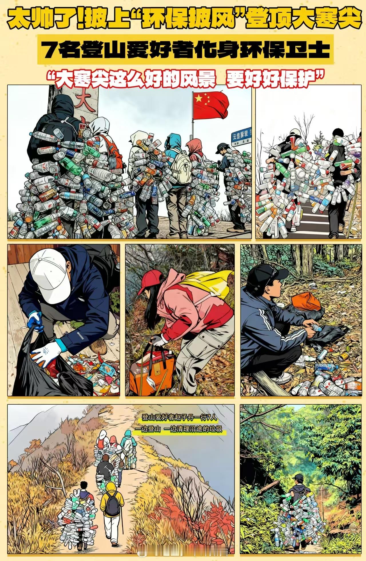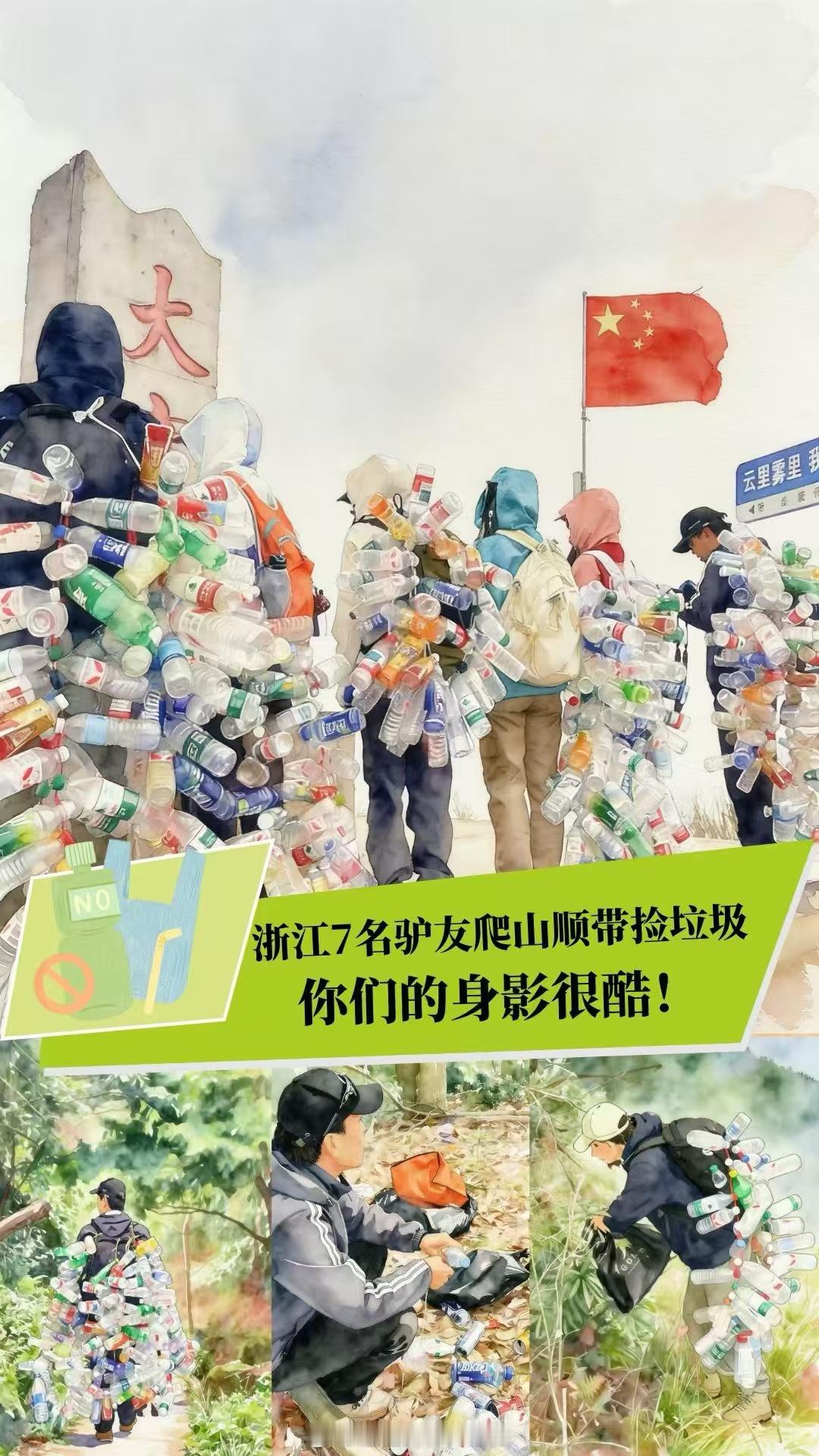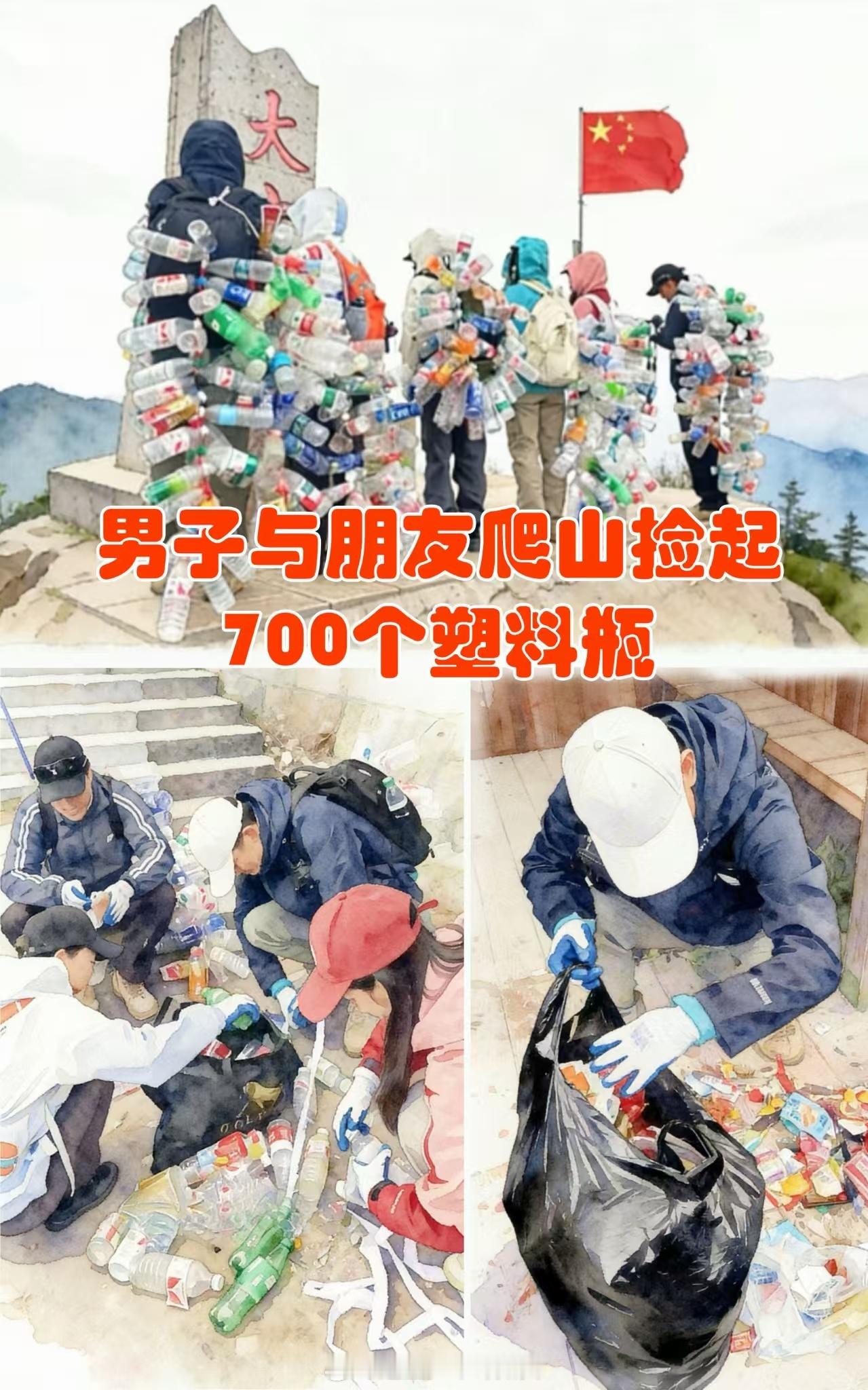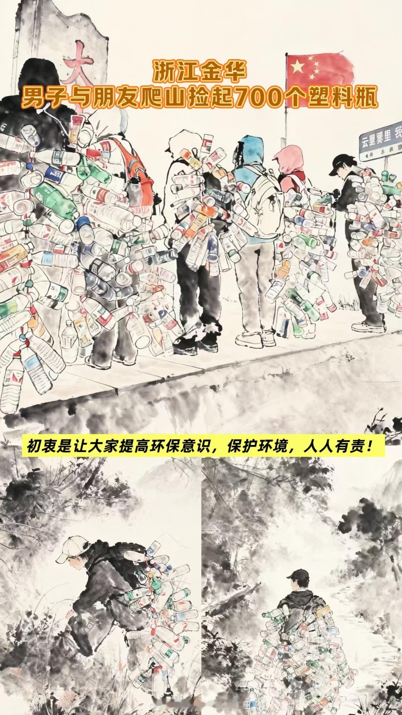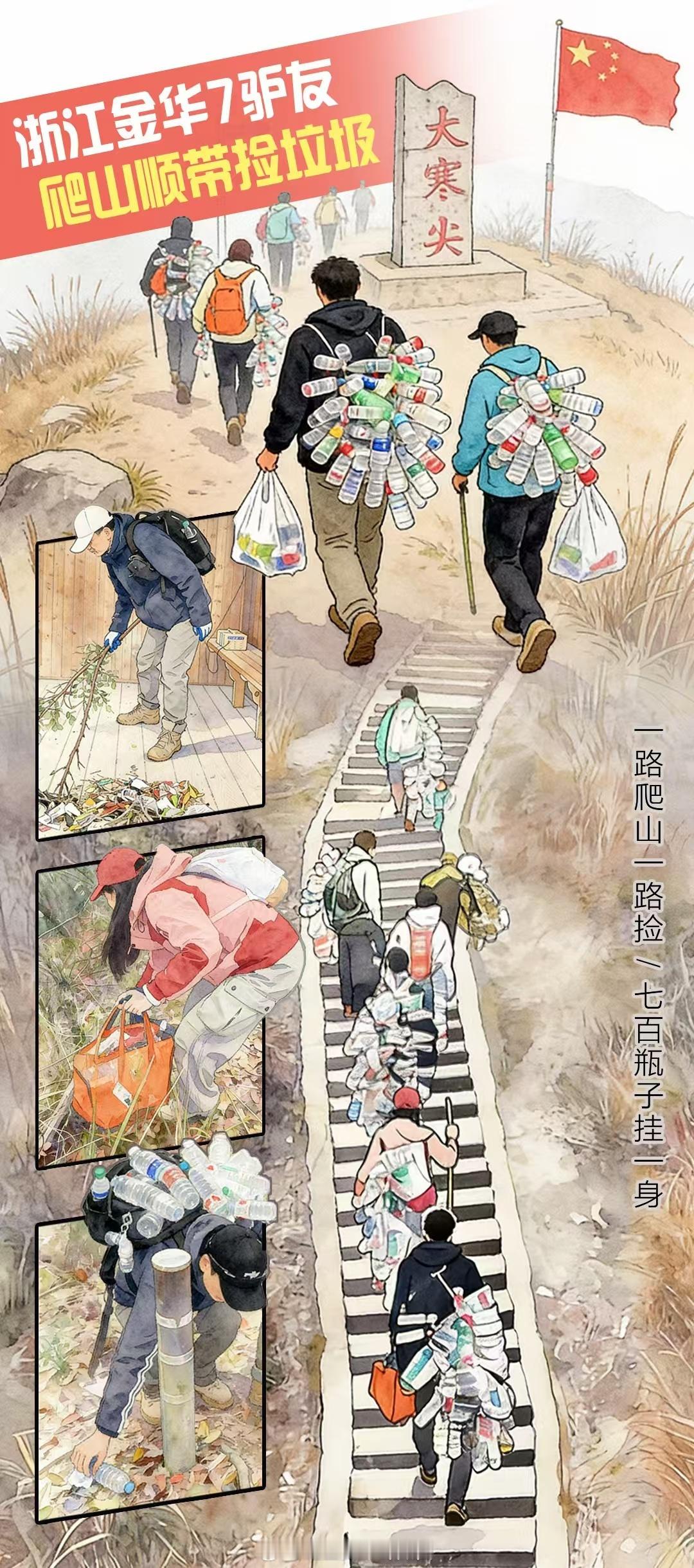 浙江驴友捡700瓶子做成战袍近日,浙江金华。7名登山爱好者化身环保卫士,自发进行“净山”。他们用绳索将沿途捡拾的700多个废弃塑料瓶串联起来,披挂在身,化身为行走的“环保卫士”。网友呼吁:“保护环境,从带走自己的垃圾开始。”八婺同心(来源:义乌市融媒体中心)
