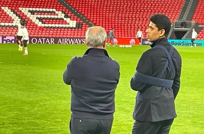 带伤督战!巴黎圣日耳曼主席纳赛尔手打石膏,观看球队训练