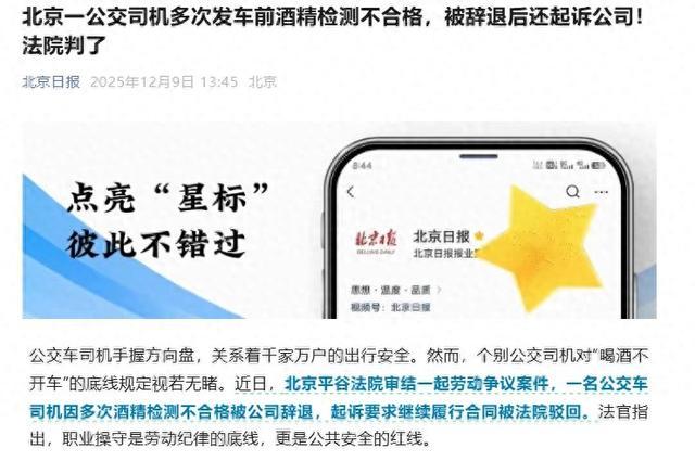 北京一公交司机多次发车前酒精检测不合格,被辞退后起诉公司,要求继续履行合同。近日,北京平谷法院审结一起劳动争议案件,法院驳回当事司机的诉求。法官指出,职业操守是劳动纪律的底线,更是公共安全的红线。