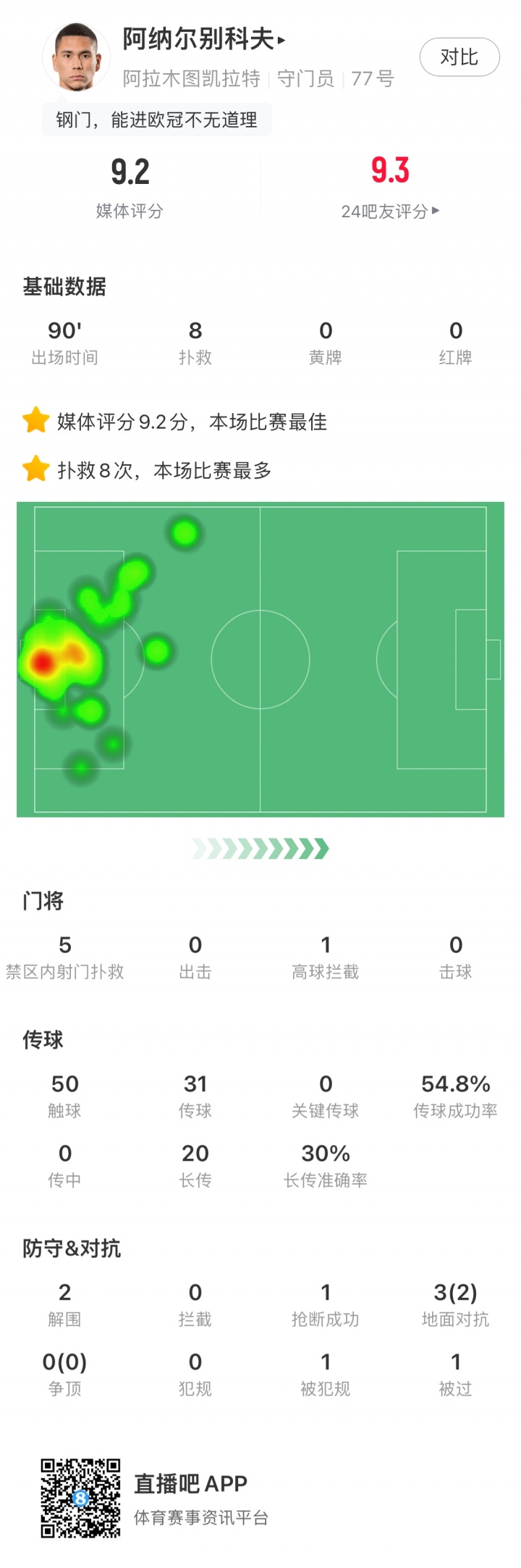 泰米尔兰·阿纳尔别科夫做出8次扑救,其中5次禁区内扑救,得到全场最高分9.2分,获得全场最佳。