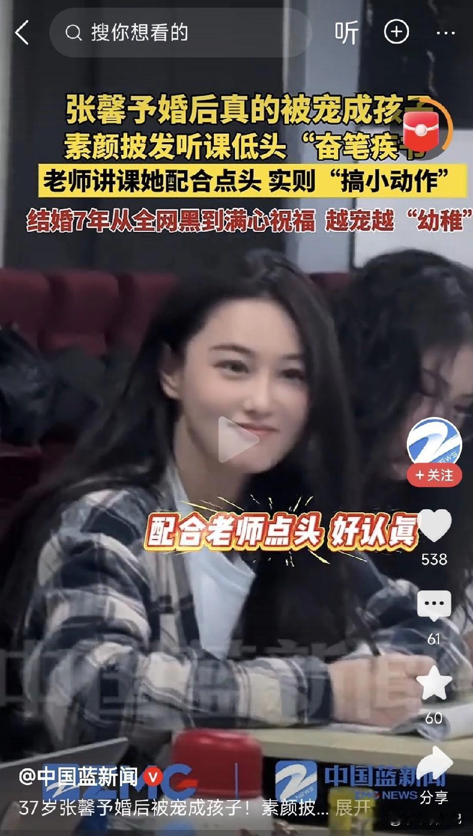 女人嫁对人,真的能改命? 看看张馨予最近素颜听课的一段视频,我惊了。 披着头发,穿着简单,坐在那儿安安静静听讲。 偶尔歪头做笔记,抬头一笑,眼睛亮的像会发光。 说她17,我都想信。 谁能想到,这是个37岁的“已婚妇女”? 想当年,张馨予谈恋爱那会,网上可没少吵。 尤其是和李晨那段,分的不明不白。李晨一篇长文发出来,她直接被推向风口浪尖。 “劈腿”、“炒作”“靠男人上位”...各种帽子全都扣上来。 代言没了,个人形象和事业大受影响,连出门都被指指点点。 那阵子,她眼里全是防备。 再后来,遇见何捷。没热搜,没官宣,低调的就像在楼下拿了个快递,回头一看——哎,人家领证了。 从那以后,她整个人都变了。 不争了,不吵了,也不用拼命立“大女主”人设了。种花、养狗、做公益、偶尔晒晒厨房... 脸上的光不是打的,是睡饱了、心安了,自己长出来的。 连眼神都变了,又“飒”又“柔”,十分迷人。 其实吧,不是嫁人能改命, 是有人兜底,才敢做回自己。 不用再逞能,想素面朝天就素面朝天,想发呆就发呆,有人替你扛着风雨,你只管悄悄变美就好。 好的婚姻,是让女人看起来“不像结过婚”。 你身边有没有那种,嫁对人后“逆生长”的朋友? 评论区让我羡慕一下呗~[大笑]
