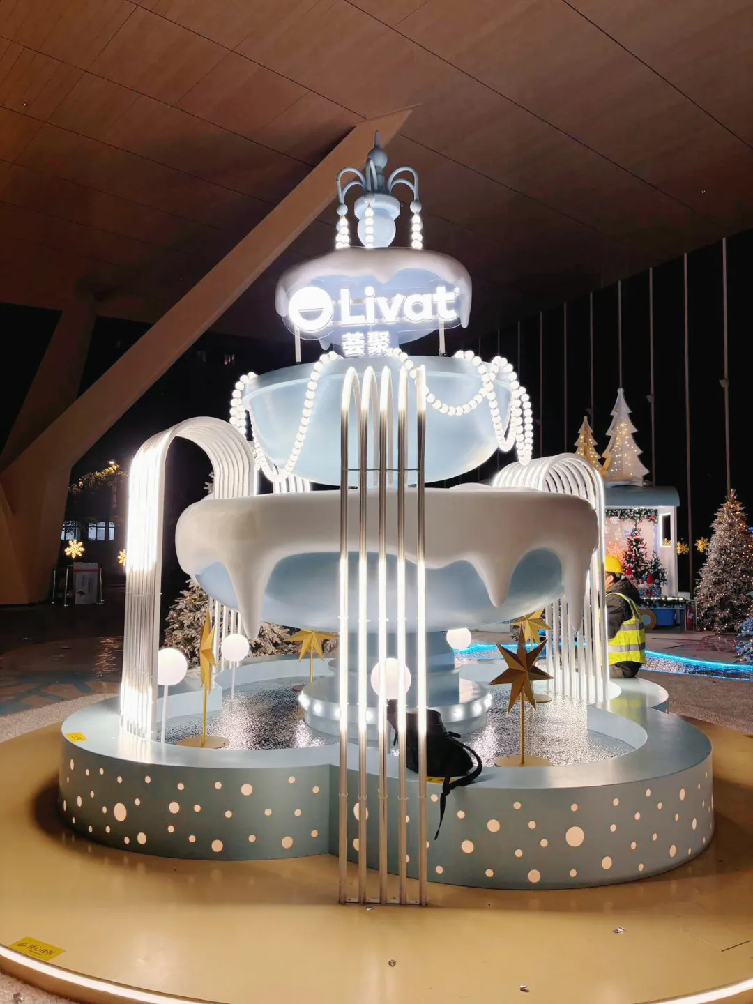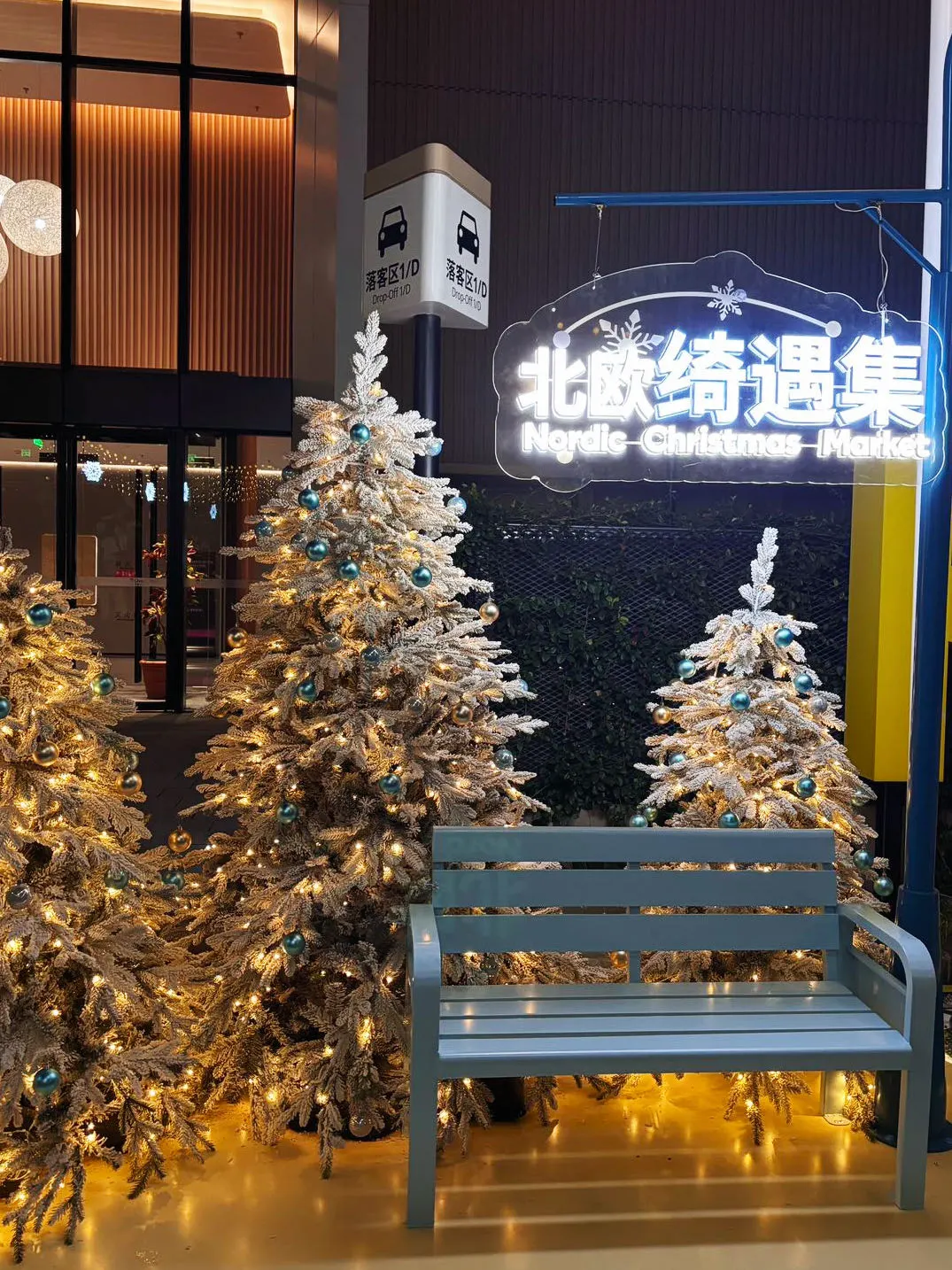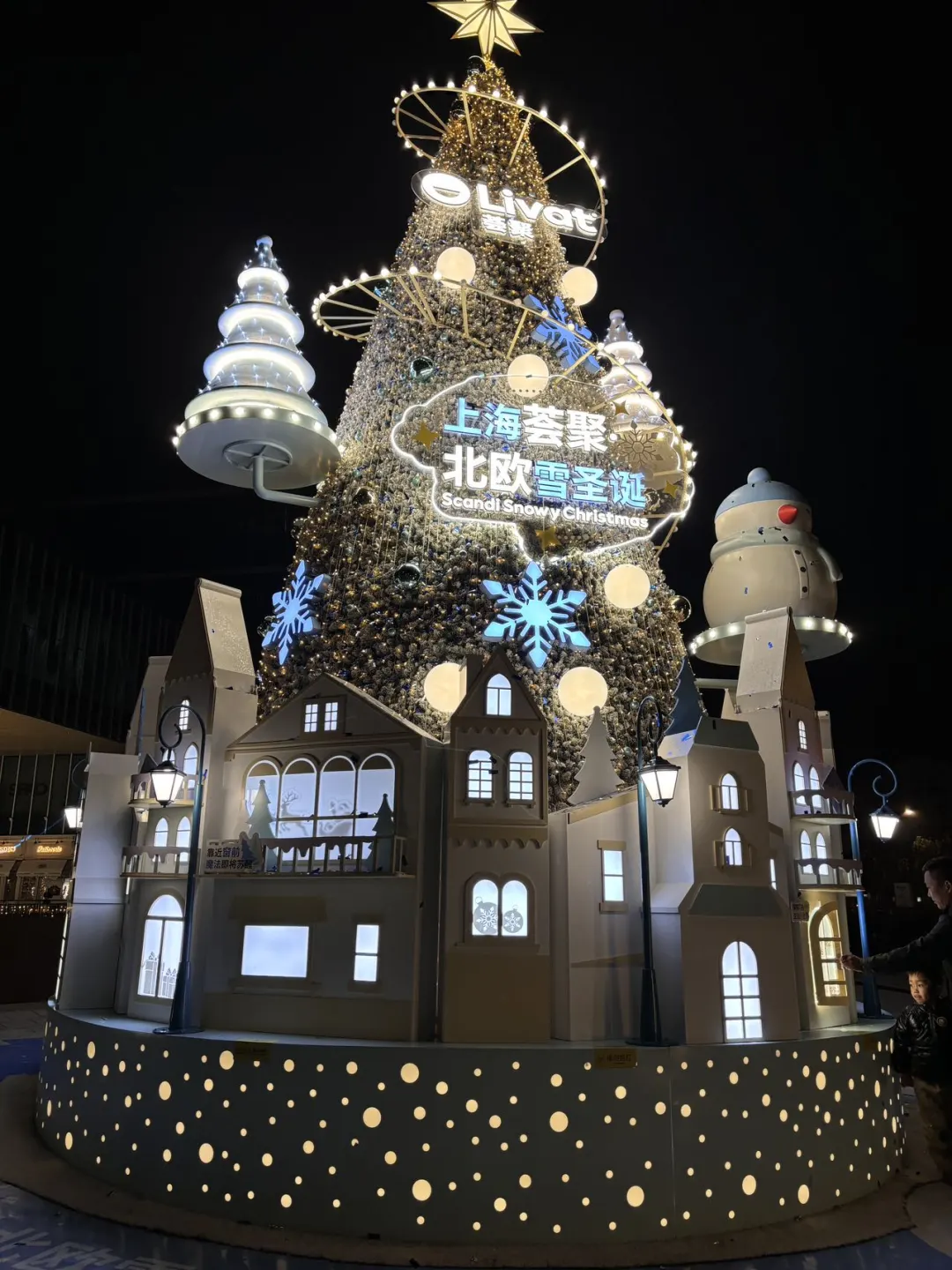 • 主圣诞树:10.5米的巨型蓝白圣诞树,这种配色很少见,整体的冰雪色调真的很特别~闪烁着温暖灯光,搭配“雪花”飘落的效果,仿佛置身北欧童话,是整个场景的C位担当