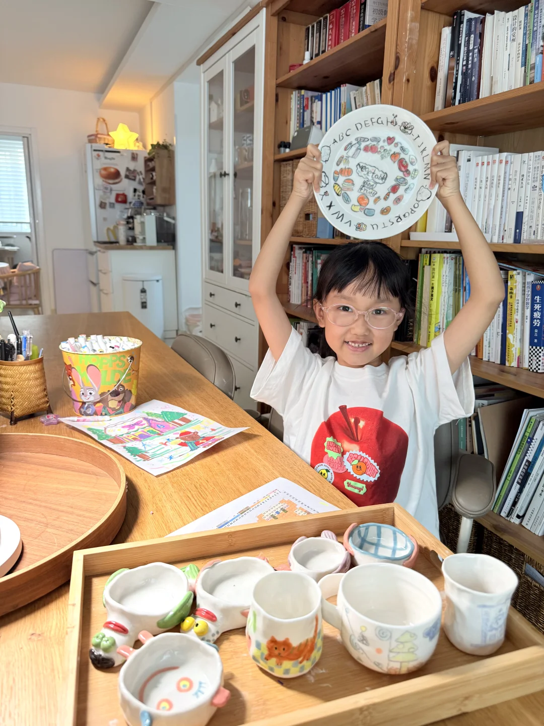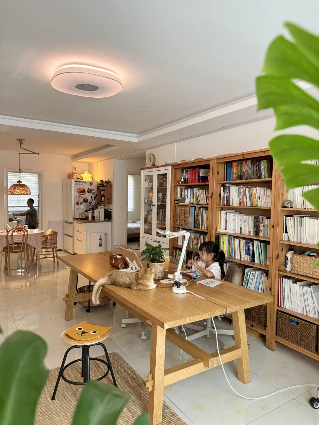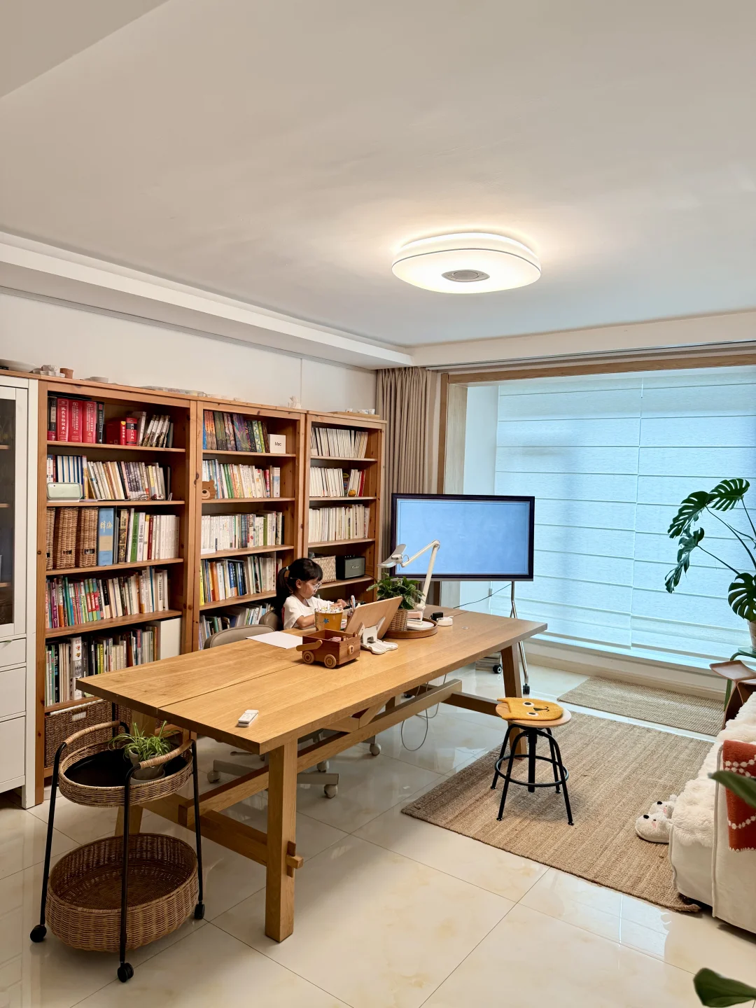 一家人都喜欢陶艺,一周前女儿自己画的盘子,爸爸给她烧制了出来,她表示超开心🍎,平时她在客厅里不是坐在书桌前画画、做手工,就是各个角落看书,本以为她会一直坐书桌旁,当时配备了台灯,但她跑来跑去,看书也是在各个角落,担心光线忽明忽暗对她眼睛不好,换成了明基Aora大主灯,这样家里每个角落都有均匀明亮的光线了