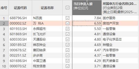上证报中国证券网讯(记者徐蔚)Choice数据显示,12月10日,资金净流入额排名前十的个股依次是N百奥、万科A、永辉超市、长飞光纤、天通股份、神农种业、襄阳轴承、步步高、中国卫通、特发信息。其中万科A当日资金净流入额为6.59亿元。