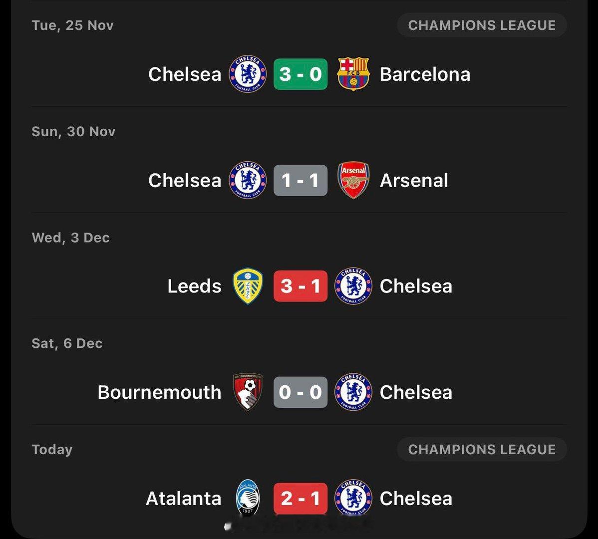 【切尔西4场不胜】11月25日,切尔西欧冠主场3比0击败巴萨。自从之后,蓝车走势不顺,连续四场比赛,两平两负难求一胜。11月30日,英超联赛,切尔西1比1阿森纳12月03日,英超联赛,利兹联3比1切尔西12月06日,英超联赛,伯恩茅斯0比0切尔西12月09日,欧冠联赛,亚特兰大2比1切尔西在经历这段低潮期之后,切尔西在联赛跌出前四(暂居第5位),在欧冠跌出前八(暂居第11位)。蓝军红黄牌和伤病导致的停赛偏多,后防线和中锋缺乏真正的核心球员,主帅马雷斯卡的轮换体系并不成功,这些都是需要解决的问题。
