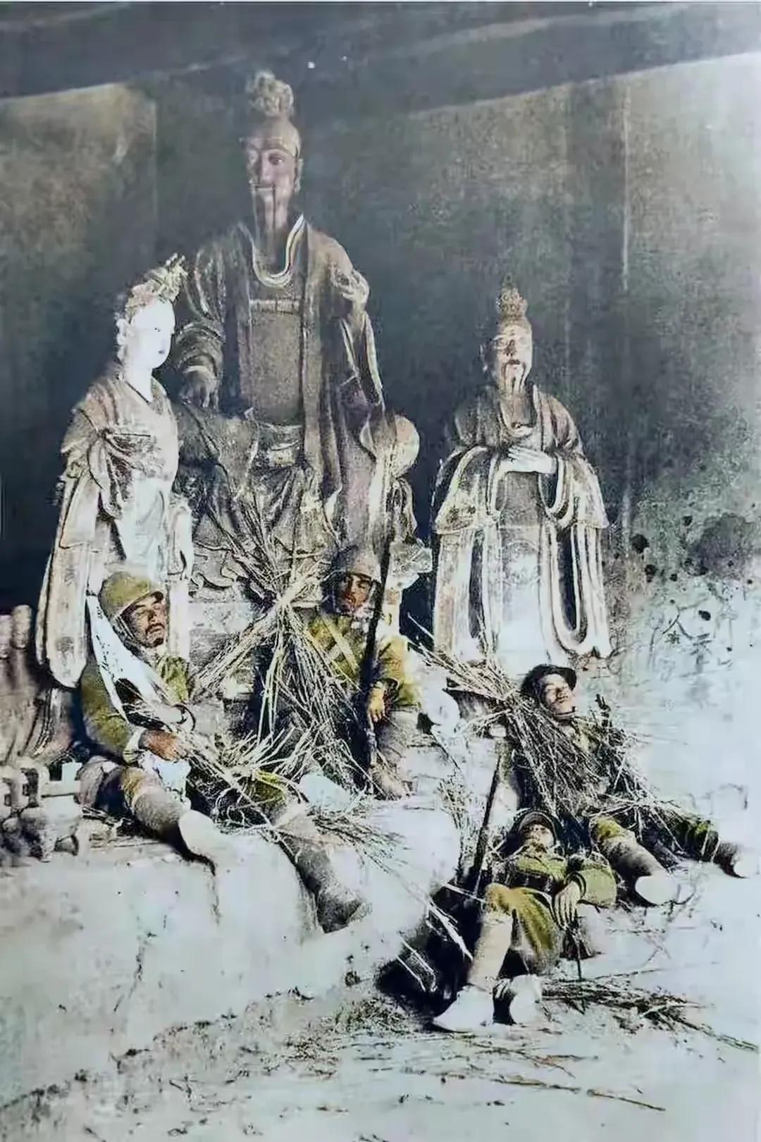1938年春,日军攻入山西后,将一座观音庙,当成了临时歇脚点。 寺内,几尊古朴庄严的神像静静矗立,尽显庄严肃穆。然而,4名日军士兵却横七竖八地倚躺在神像前,他们抱着三八大盖icon步枪,身上盖着干枯的草枝,军靴上的泥土和草屑散落四周,将这里当作了他们肆意休憩、毫无敬畏的场所。 山里的春天来得迟,破窗户纸被风吹得呼嗒响,庙堂梁上悬着的旧幔布也跟着晃。观音垂着眼,脸上那层金漆早就斑驳了,嘴角却还是老样子,微微扬着,像在看你,又像什么都没看。香案积了灰,原本该摆供果的地方,眼下扔着几个瘪掉的罐头盒,油污渍在木头缝里,渗成深色的圈。 他们睡着了,鼾声粗重,混着一股皮革混合汗酸的气味。有个年纪轻的,帽子歪在一边,梦里还皱着眉,手抓着枪带子。草枝是从庙后随手扯的,枯黄带着土,就这么胡乱搭在身上。靴底沾的泥块干了,碎在砖地上,一块一块,和原本扫得干干净净的砖面格格不入。阳光从门缝斜切进来,光柱里尘土飞扬,飘过他们脏污的军衣,飘过冰冷的三八大盖,最后落在观音踩着的莲台上。那光倒是公平,照着菩萨衣褶的宁静,也照着刺刀上那点未擦净的、暗沉沉的光。 这庙不知立了多少年,山下的老人说,他爷爷小时候就在这儿磕过头。以往这时候,该有婆姨挎着篮子来供新摘的野花,老太太小声念着保平安的经。如今只剩风吹过空院子的呜咽,像低低的叹气。菩萨还是那副慈悲模样,可眼下这份慈悲,对着满屋的狼藉和酣睡的侵略者,沉默得叫人心里发堵。 你说他们真能睡踏实吗?或许吧,累极了的人哪管身在何处。但那种把神圣当寻常、把别人的信仰角落随意践踏成马棚的肆意,比明火执仗的抢劫更透着骨子里的傲慢。他们不觉得这是冒犯,可能压根没想过这问题。枪杆子握在手里,脚下的土地就是“占领区”,一切都可以为战争让路,神佛也不例外。这种思维本身,比枪炮更可怕,它抽掉了一个民族对另一份文明最基本的、哪怕只是表面上的尊重。 战争扭曲的不只是山河,还有人心里那点该有的分寸。你看那尊观音,她见过多少代人的祈愿,听过多少风雨,如今却被迫见证这一幕:侵略者以征服者的姿态,在她的注视下卸下武装,短暂地回归为疲惫的动物,而这份疲惫,正是他们施加于这片土地的痛苦所换来的。这里本是一处让人心安的地方,如今连这份安宁也被征用了,成了侵略路上一个无足轻重的注脚。 庙外头,山风一阵紧过一阵。不知道这场仗还要打多久,不知道这庙还能不能等来重新上香的那一天。只是那一刻,凝固在破败庙堂里的画面,像一根刺,它告诉你,有些伤害,不止于烧杀抢掠,还有一种冰冷的、将一切崇高与温柔都粗暴地拖入泥泞的平常。 各位读者你们怎么看?欢迎在评论区讨论。