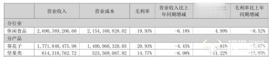而探索新领域的背后是洽洽食品主营业务的承压。财报数据显示,洽洽食品前三季度营业收入为45.01亿元,同比下降了5.38%,归母净利润为1.68亿元,较去年同期大幅缩水73.17%。而在今年上半年,公司核心业务葵花籽收入同比下滑4.45%至17.72亿元,毛利率下降7.67个百分点至20.93%,而第二增长曲线坚果类产品收入同比下降6.98%,毛利率大幅下降13.95个百分点至14.77%。