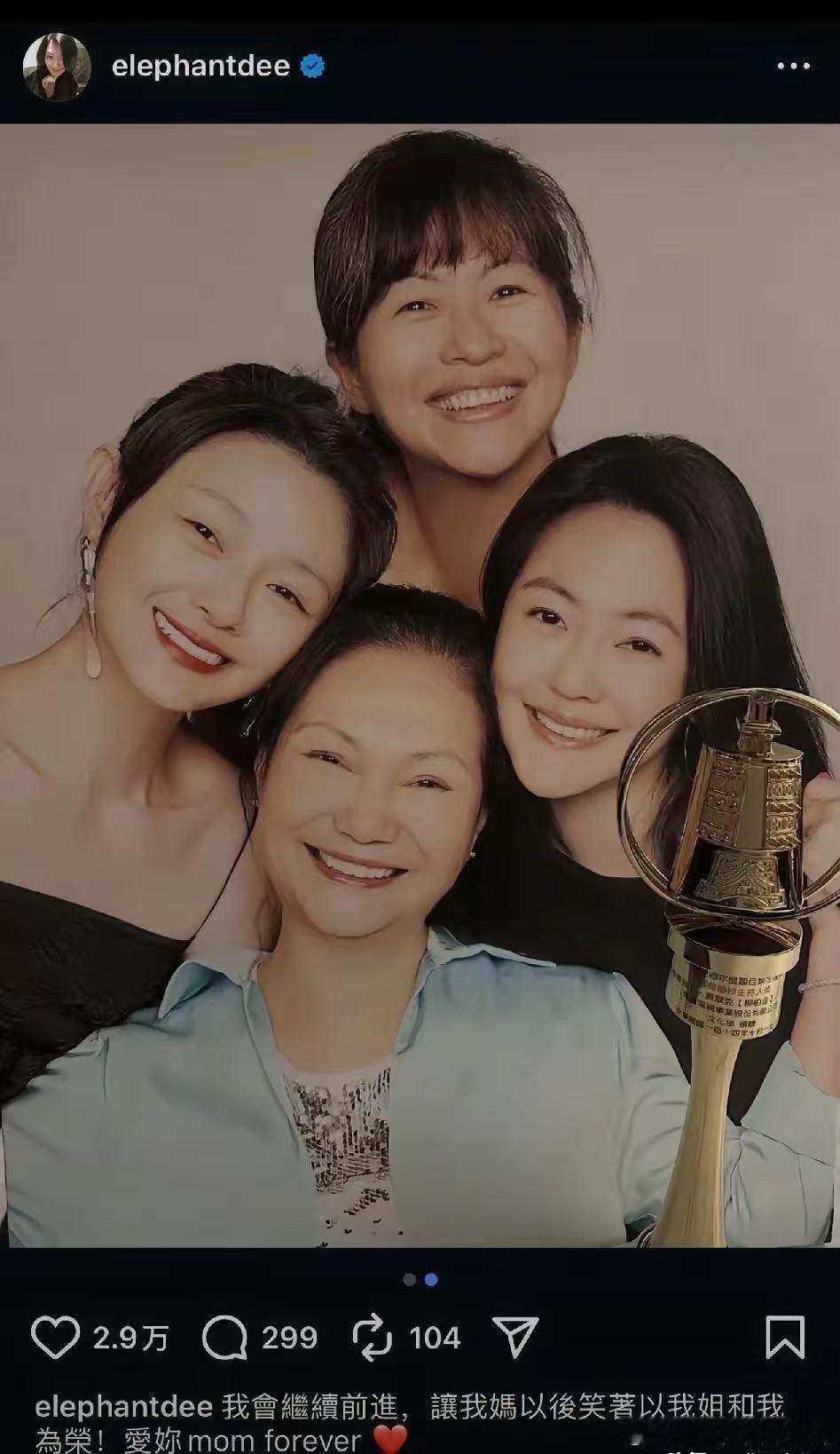小S晒母女四人全家福小S晒母女四人全家福,S妈捧起奖杯眼中含泪,这个奖杯是给妈妈最好的礼物s妈含泪捧起金钟奖杯