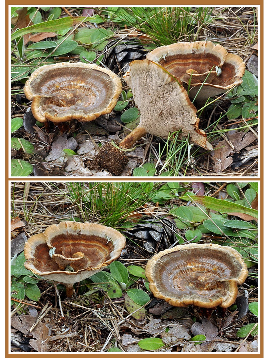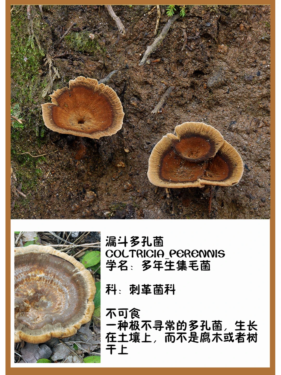 漏斗多孔菌 coltricia_perennis 学名:多年生集毛菌 科:刺革菌科 图片©manatarka.org ©josef hlasek 不可食 一种极不寻常的多孔菌,生长在土壤上,而不是腐木或者树干上 菌肉极硬,菌管稍延生至被绒毛的菌柄
