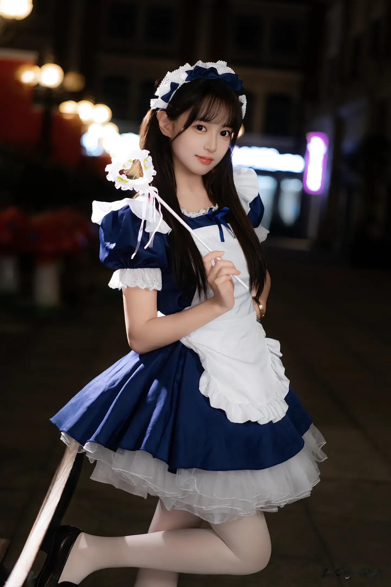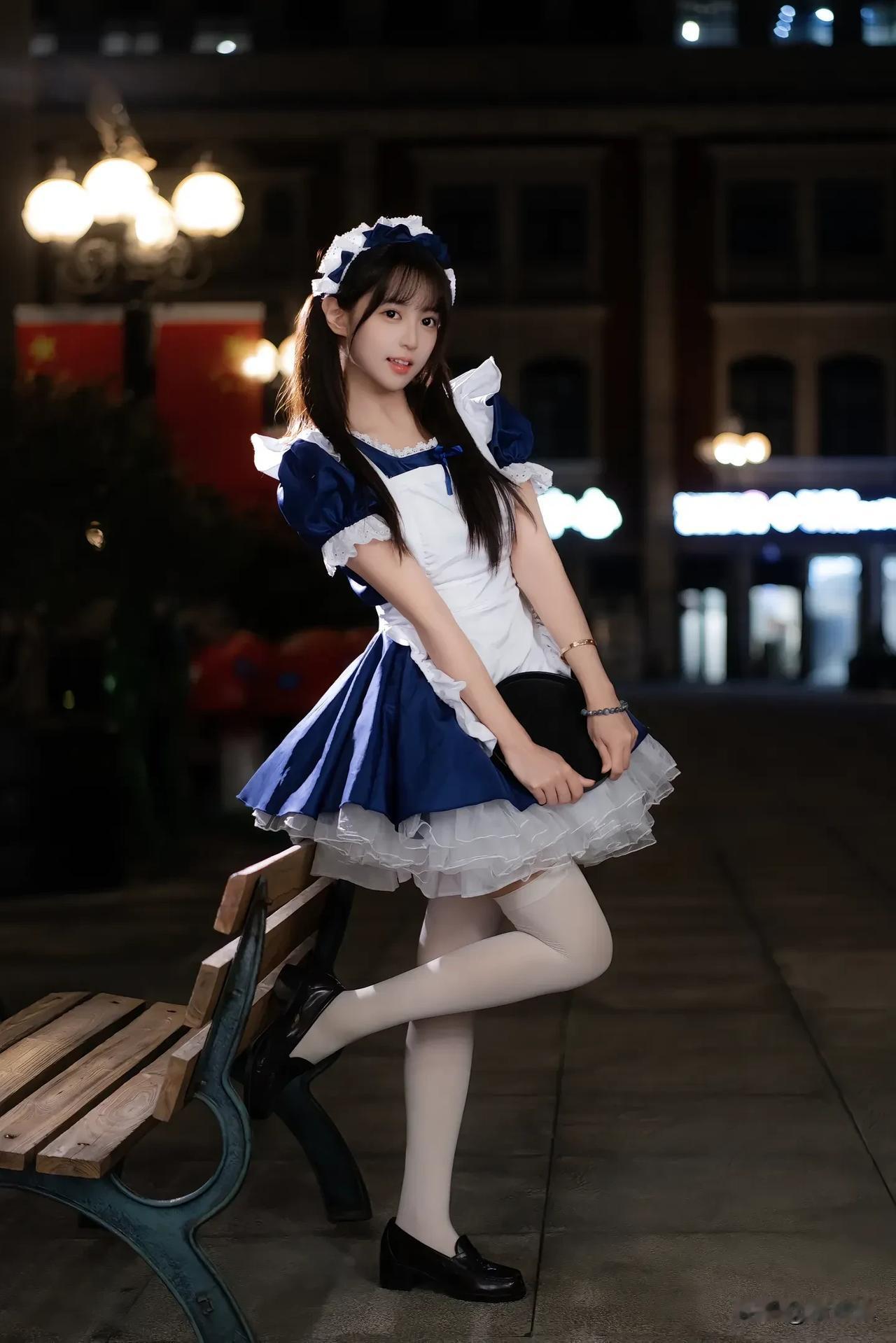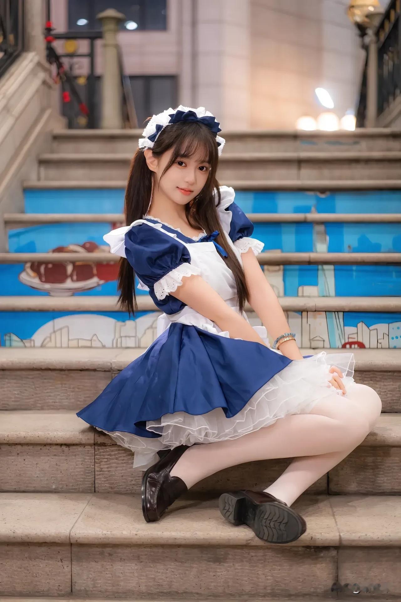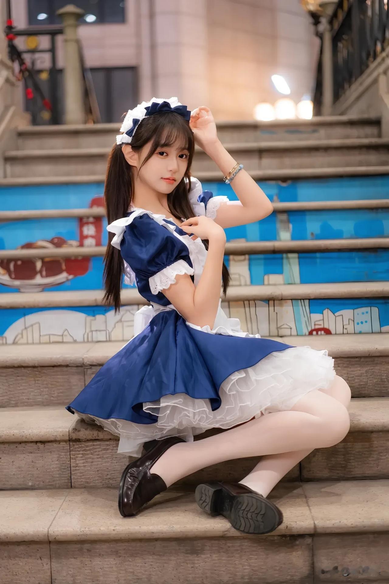 梦幻的蓝白女仆装,坐在购物车里,甜美可爱!💖🛒