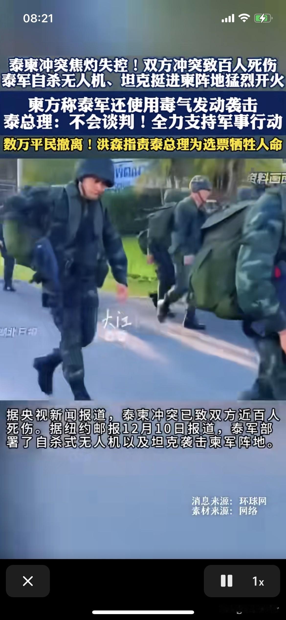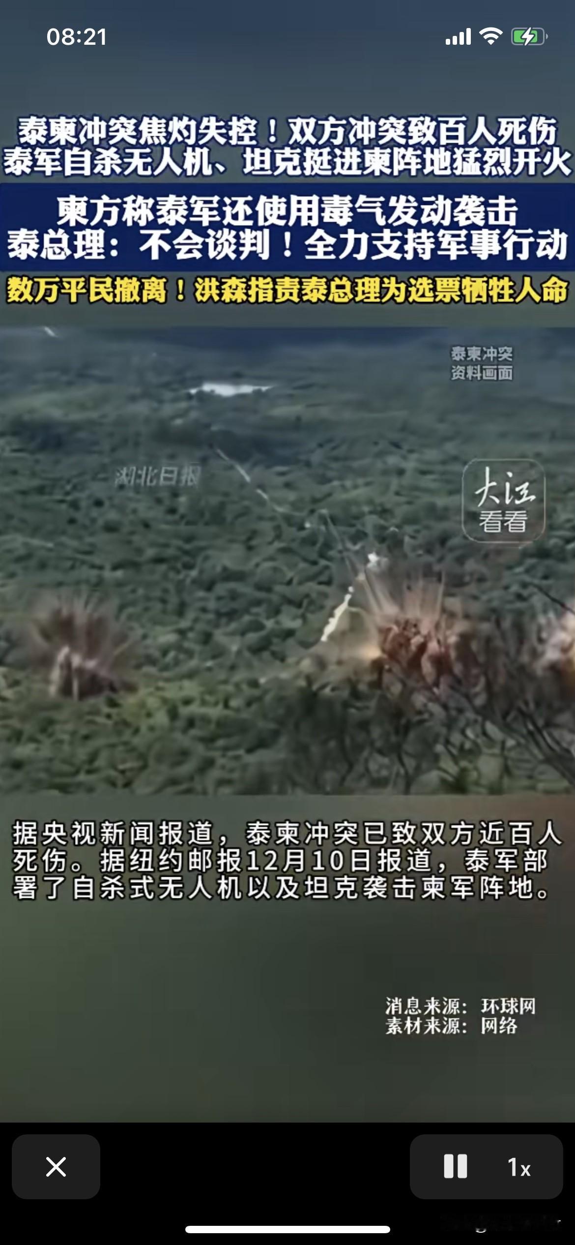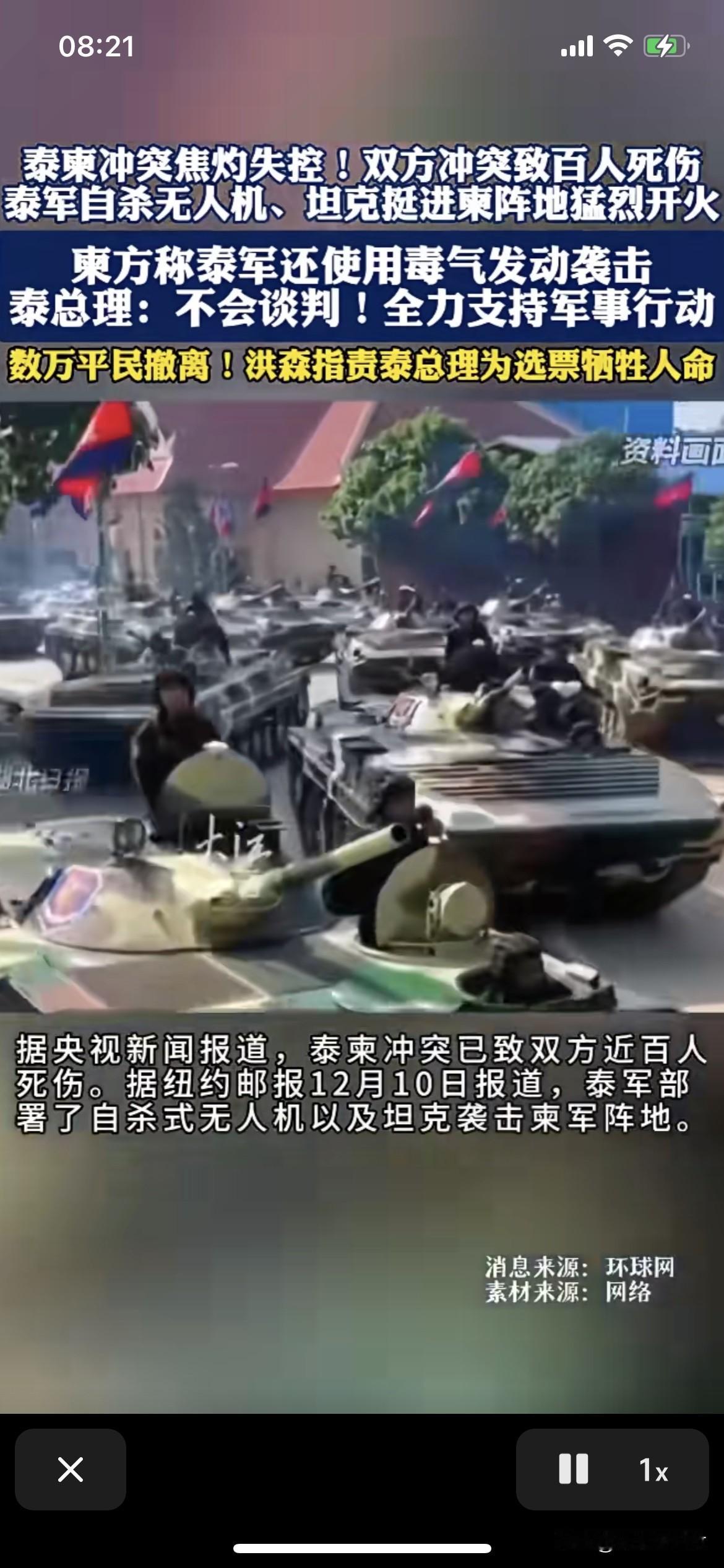 泰国使用无人机坦克袭击柬埔寨阵地 泰国和柬埔寨已经打了好几天了,泰方全方位进攻猛烈,无人机、坦克袭击柬埔寨阵地。柬方老百姓流离失所。据报道主要袭击电诈园区。双方冲突已经死了数百人。继续下去还会有更多人员伤亡。