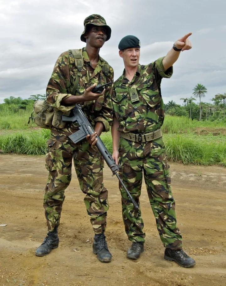 一名携带 L1A1 7.62 毫米半自动战斗步枪的塞拉利昂士兵接受 IMATT(国际军事援助和训练队)英国顾问的指导。