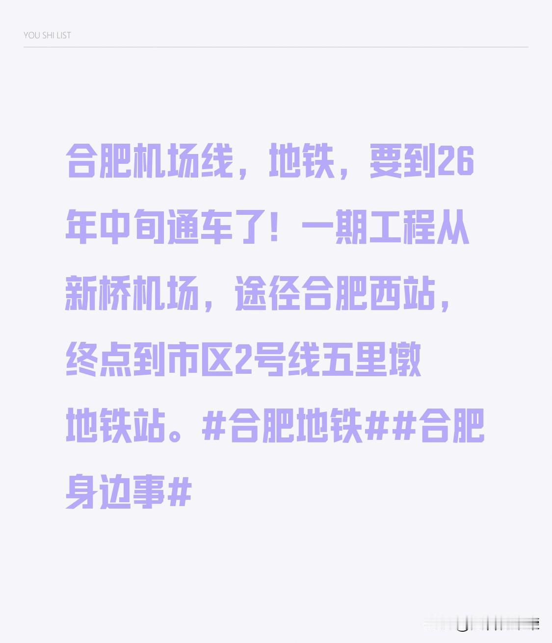 合肥机场线地铁预计2026年中旬通车! 一期工程从新桥机场出发,途经合肥西站,终点为市区2号线五里墩地铁站。