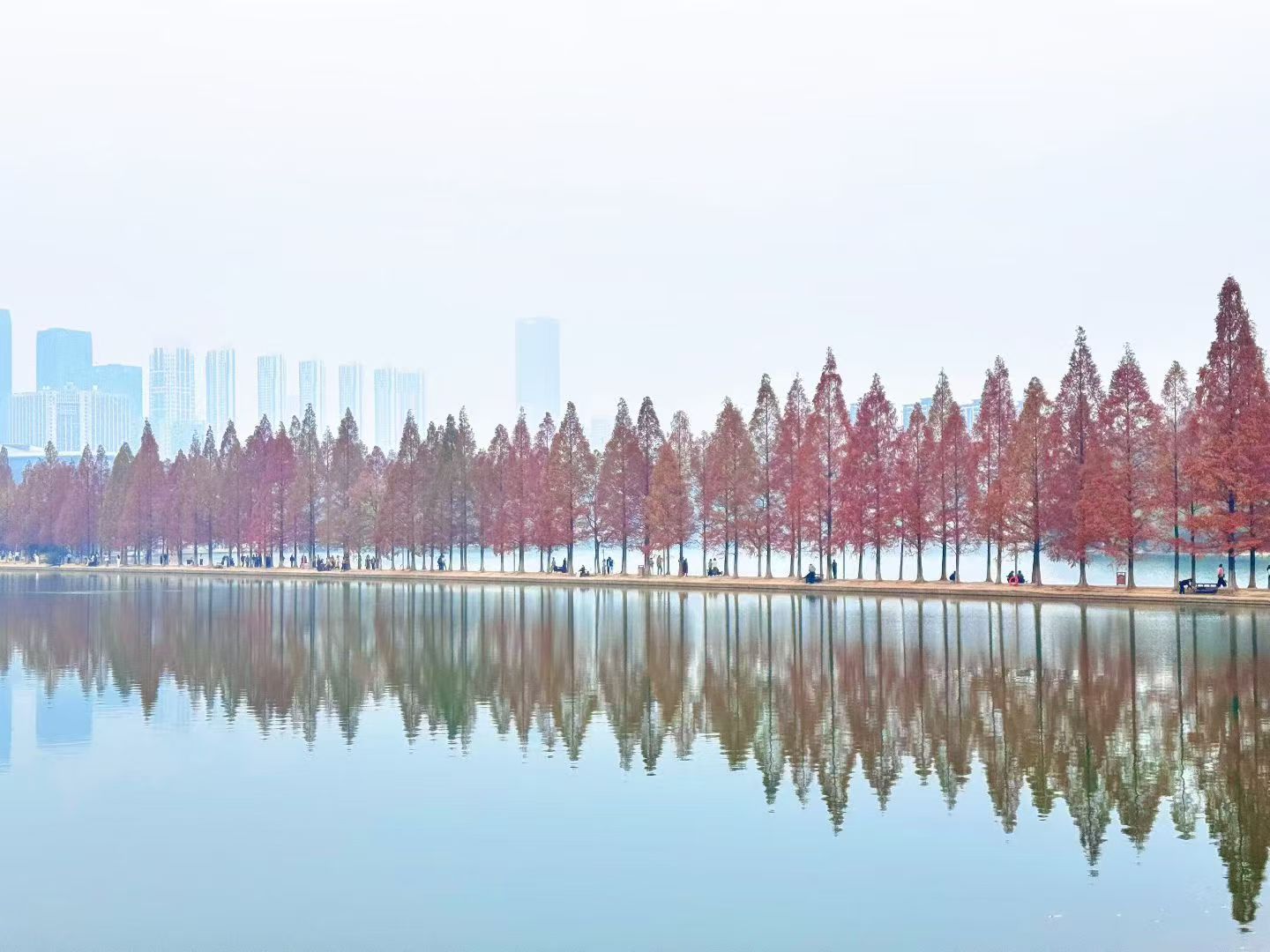 ✅年嘉湖水杉林:位于年嘉湖西侧的水杉步道,是秋日的氛围感担当。200余米长的中堤两排水杉,在夕阳的映照下染成暖金色,光从叶缝里漏下来,仿佛洒了一地碎金🌟。