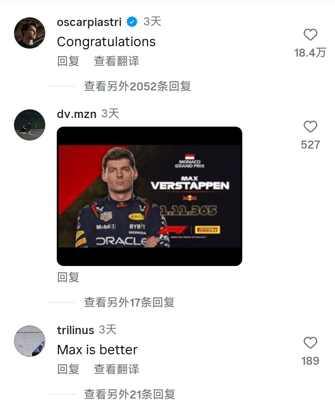 评论区涌入了来自F1围场内外的祝贺,诺里斯的竞争对手们也纷纷向这位新科冠军送上祝福。
