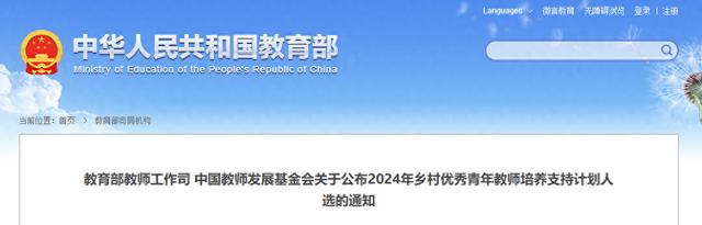 为贯彻落实全国教育大会精神,推进教育强国建设,培养造就高水平乡村教师队伍,教育部教师工作司、中国教师发展基金会实施2024年乡村优秀青年教师培养支持计划。经省级教育行政部门推荐、资格审查、公示等环节后,最终确定2024年乡村优秀青年教师培养支持计划入选教师300人,现予以公布。