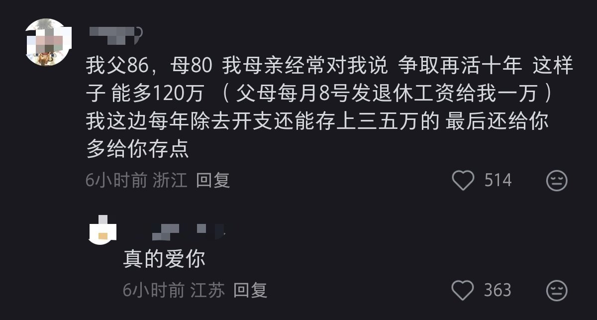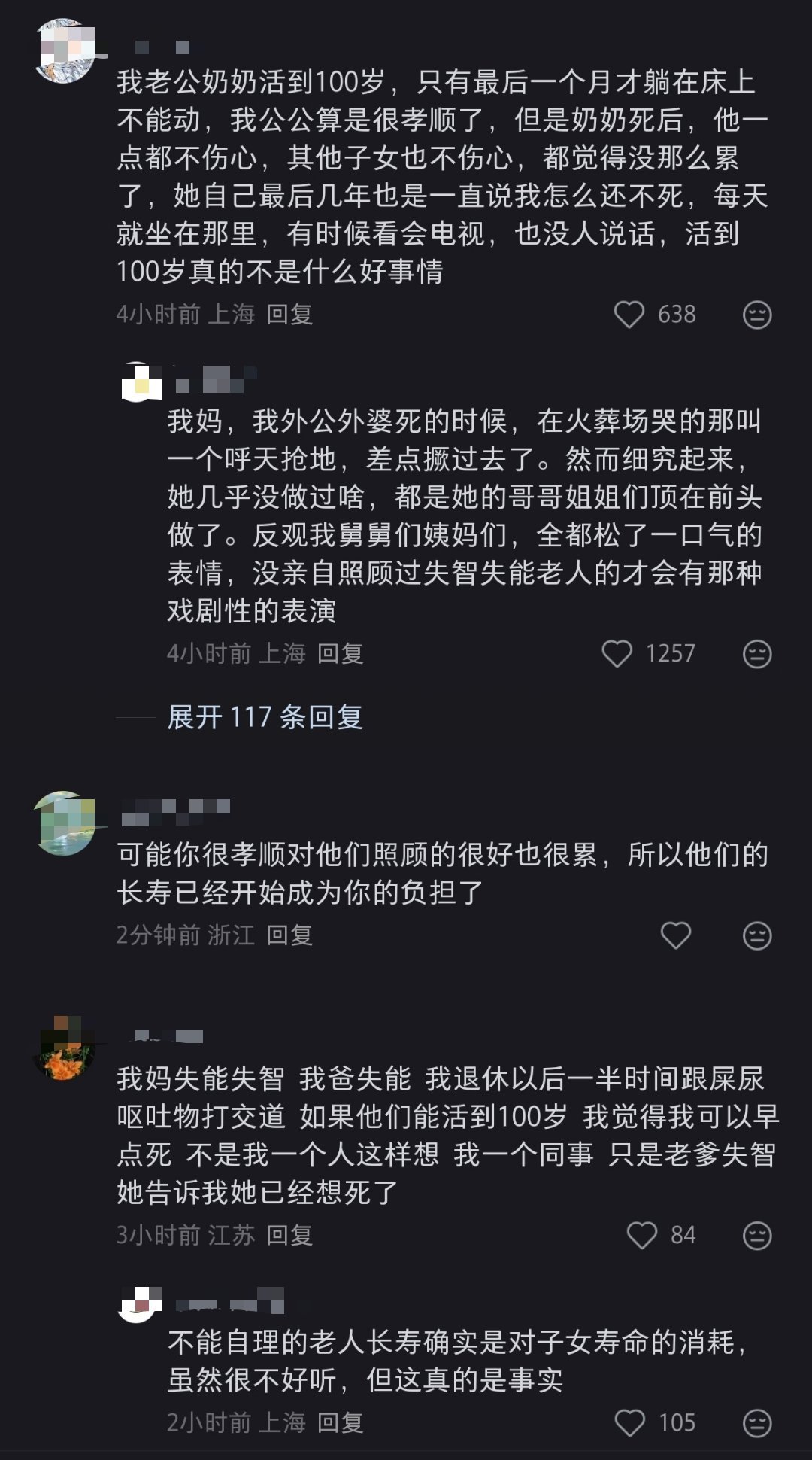 想生孩子的,可以看看这个评论区。当然,肯定有那种深爱父母希望他们长命百岁的,但也有怕父母长命百岁的子女