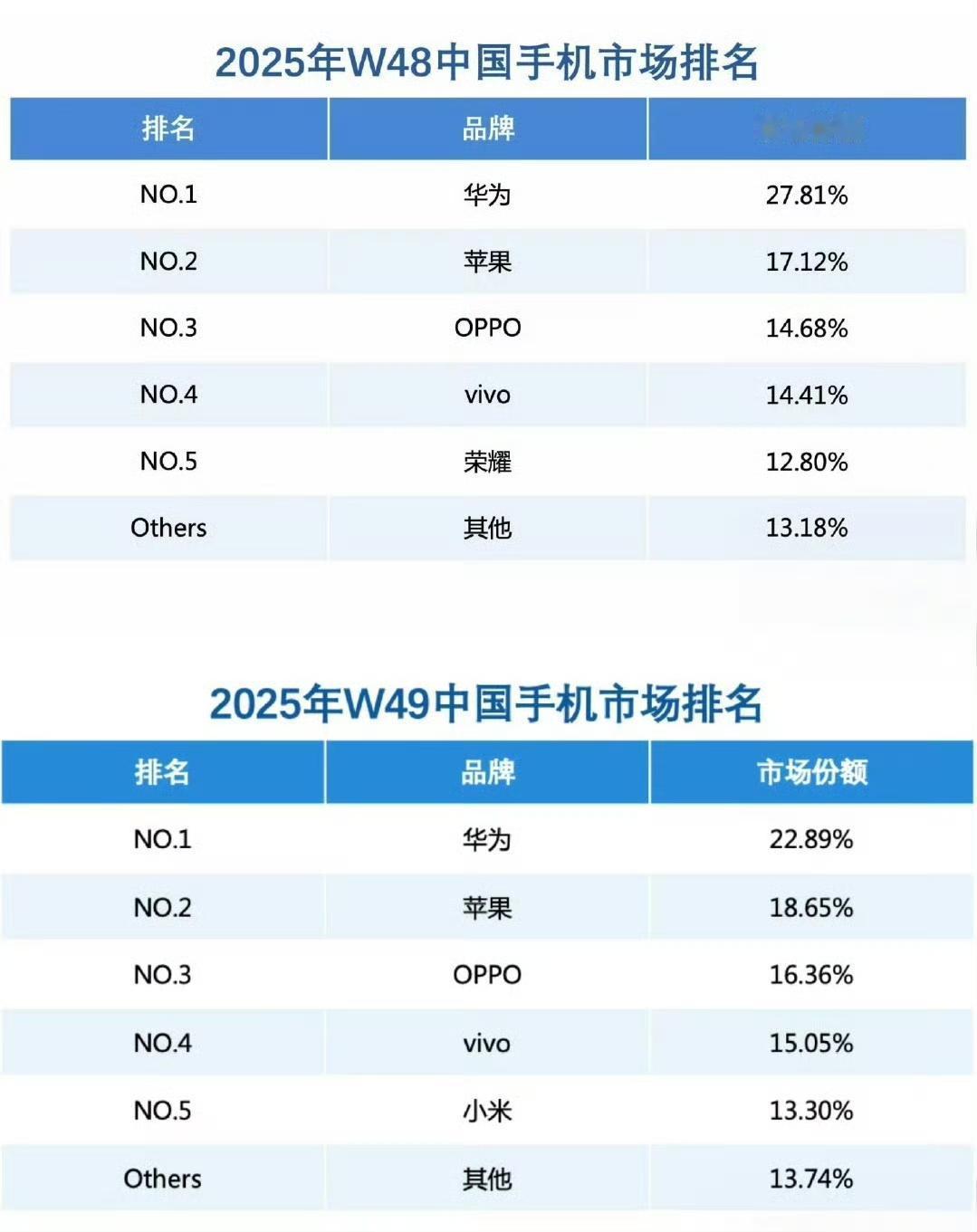 【一鲨·快评】12月11日,据BCI最新发布的数据显示,自华为Mate80系列发布以来,华为手机国内市场份额连续2周超越苹果,分别拿下27.81%和22.89%的市场份额,重夺国内市场份额第一。 这一数据具有双重维度的行业意义: 1、如果说IDC数据的Q2 18.1%的份额登顶还只是开胃菜,那么BCI第48周近28%的份额,则是对华为供应链交付能力和高端产品号召力的实质性验证。在Mate 80系列的发布窗口期,能够承接住如此巨大的市场爆发量,可以说困扰华为多年的产能瓶颈已被基本突破,其高端制造链条已恢复至“满血”状态。 2、数据客观显示,即便在华为强势进攻下,苹果依然保持了17%-18%的稳健份额。这表明,中国手机市场并非简单的“此消彼长”,而是正在形成华为与苹果的“双极引力”格局。华为的回归,打破了过去几年苹果在5000元以上价位段“一家独大”的真空期,迫使市场竞争回归产品力、生态体验与品牌价值的正面硬刚。mate 80