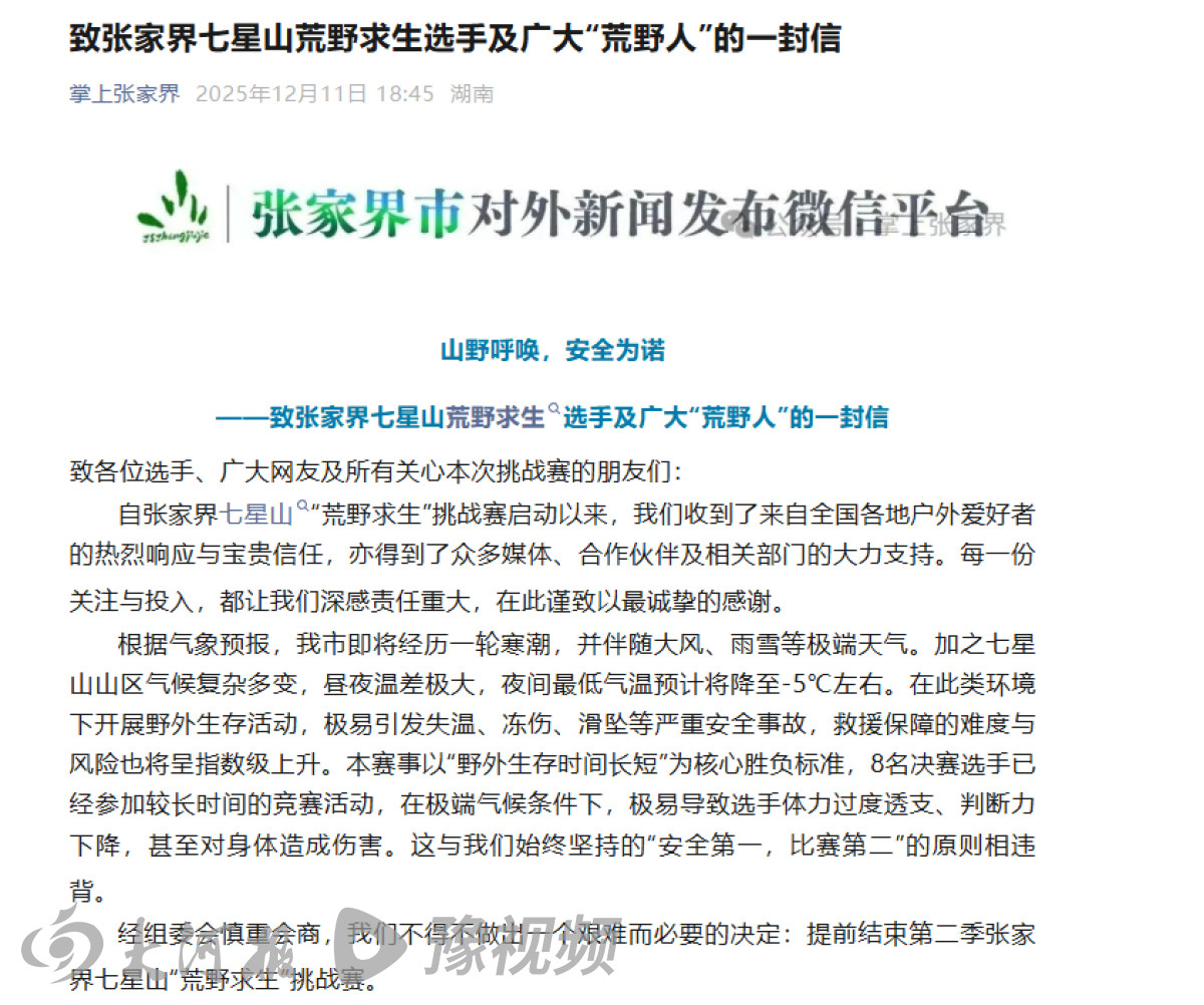 12月11日18时45分,“掌上张家界”微信公众号发文称提前结束第二季张家界七星山“荒野求生”挑战赛。