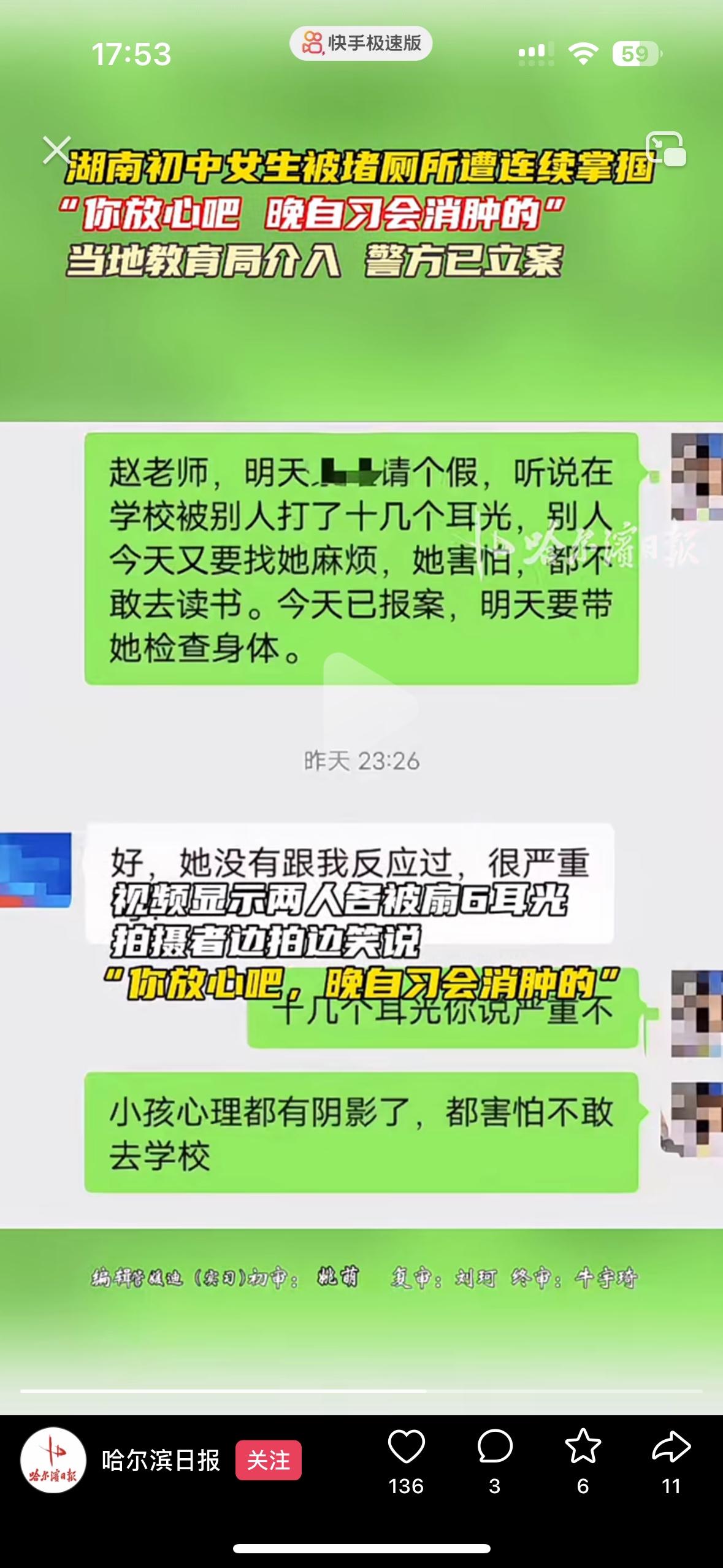 建议全国家长都学习这位妈妈的做法,这样自己的孩子才不会受欺负 一位湖南初中女生的妈妈报警了,因为她的女儿在社交平台拉黑了骂她的同学 她被同学带着校外人堵在厕所门口,被掌掴,她被打的脸颊红肿一节课都在没回教室!周围的同学还问她耳光吃饱了嘛?打她的女生说,放心吧,晚自习会消肿的 现在女儿被打的不敢去学校,因为还会找她的事!妈妈勇敢的选择了报警,而不是让孩子委曲求全!