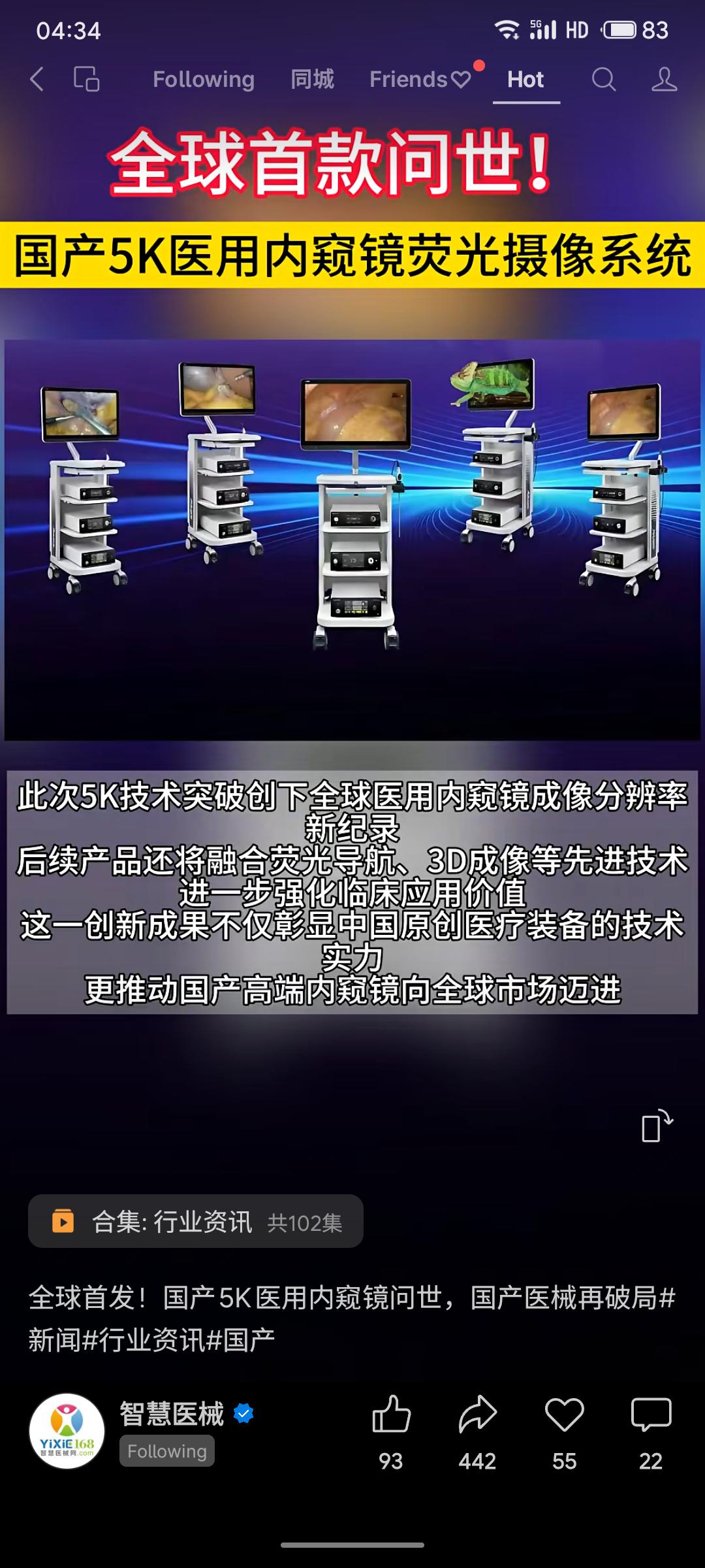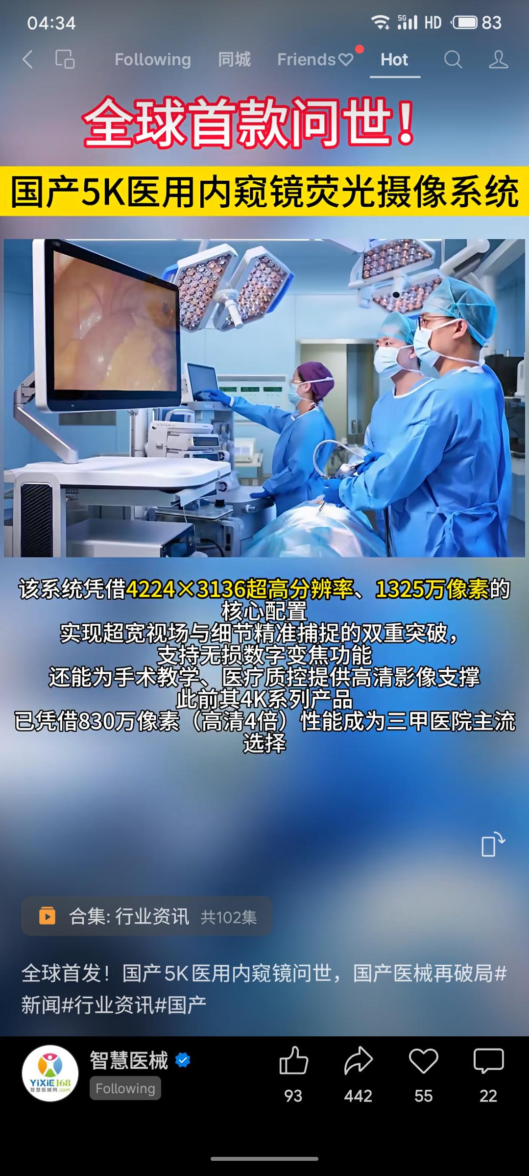 2025年12月11日,麦科田医疗旗下品牌美润达发布全球首款5K医用内窥镜荧光摄像系统,拥有1325万像素和超高分辨率,填补了该领域技术空白。这标志着国产高端医疗影像装备迈入超高清新时代,将有力推动国产医疗器械的全球市场竞争力。