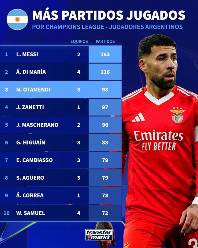 直播吧12月12日讯德国转会市场统计了阿根廷球员的欧冠出场次数,并列出榜单,梅西、迪马利亚前两名,奥塔门迪升至第三位。