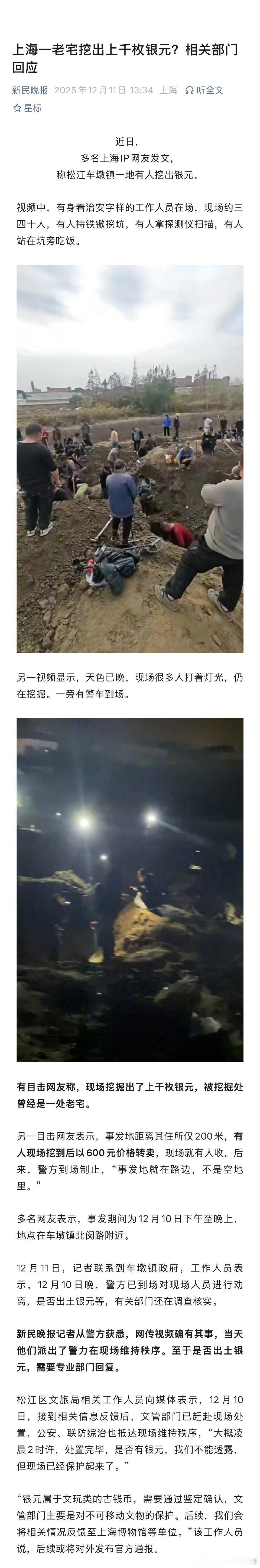上海市民扎堆挖银元这一看就不是上海人啊2025还有人组队挖银元是不是来搞笑的上海松江区一处普通工地因网传"挖出银元"引发数十人彻夜扎堆挖掘,甚至出现单枚600元现场转卖的传闻,但官方核查后多次强调"未发现任何实物证据",事件真实性陷入罗生门。一、事件核心进展集体挖掘行为与管控措施12月10日下午至深夜,上海松江区车墩镇北闵路一处河道改造工地(实为普通宅基地)聚集约30—40名市民,多人携带铁锹、金属探测仪彻夜挖掘。网传有人挖出上千枚"西班牙双柱银元",部分人以单枚600元价格现场转卖给收购者。警方于10日晚劝离人群,11日增设警力封锁现场禁止进入;松江区文旅局文管部门同步介入保护现场。官方核查结论实物证据缺失:松江区政府、施工方及文物部门多次核查,施工人员、周边居民均表示"未亲眼目睹银元实物",文物部门未收到任何主动上交物品。工地性质澄清:施工方明确该地为普通河道改造工程中的宅基地,否认"历史老宅"或"清末埋藏"的说法,网传关联《南京条约》等推测无实证支持。