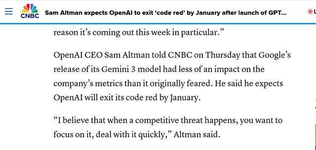 据悉,此前面对谷歌Gemini3带来的市场竞争压力,OpenAI内部启动"红色警报"机制,集中核心资源对ChatGPT进行优化升级。奥特曼表示,面对行业竞争威胁,企业需保持专注并快速响应,这一机制为技术迭代提供了重要保障。