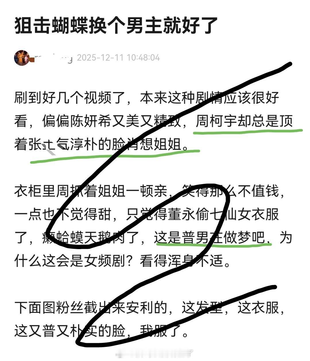 老实说,《狙击蝴蝶》这剧选周柯宇来做男主真的是个败笔,他在剧里真的很普,长得不好看演技还差,经常一到他的戏份就容易出戏