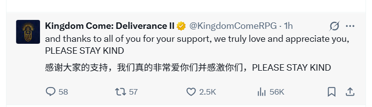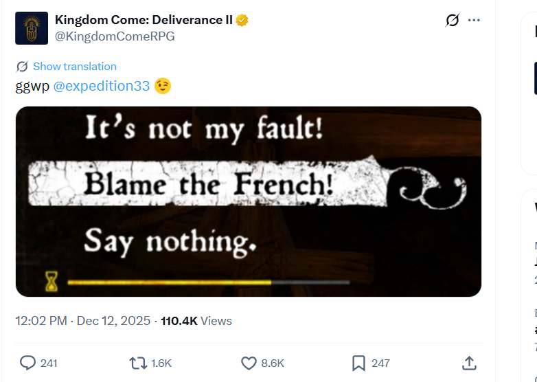 【《天国:拯救2》TGA颗粒无收,官方调侃回应】TGA年度游戏直播已经结束,《天国:拯救2》在TGA上没有获得任何奖项,官方对《光与影:33号远征队》发起了祝贺,并配上图文:“GGWP,祝贺《光与影:33号远征队》,谢谢大家的支持,我们真的非常爱你们并感激你们,请大家保持善良”《天国:拯救2》官方发布整活图片“谴责法国人!”,还有玩家发布了《天国:拯救2》“盗圣亨利”上台偷走奖杯的图片。GGWP是"Good Game, Well Played" 的缩写,意思是“打得好,玩得漂亮”,通常在游戏结束时,无论输赢,用来向对手和队友表示尊重、赞扬对方表现的礼貌用语。