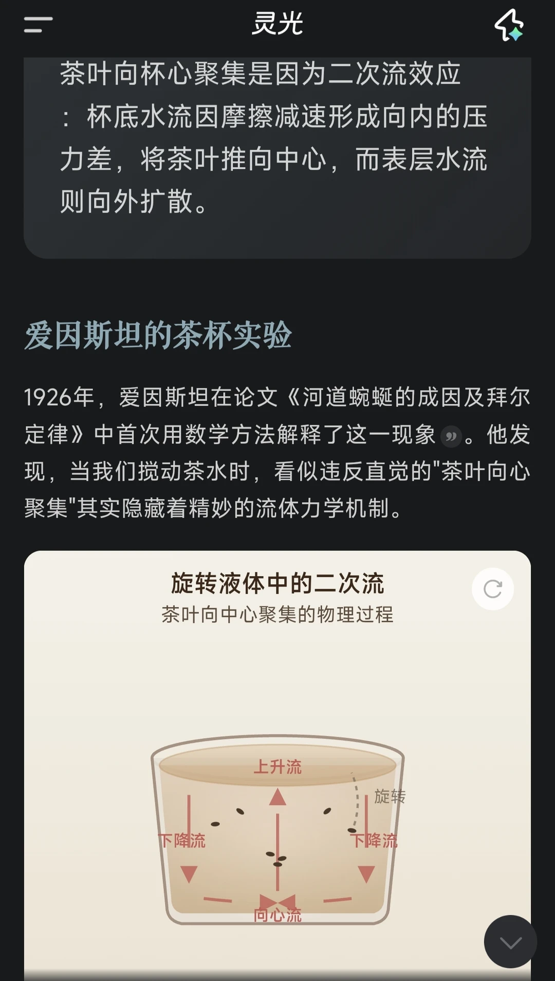 搅动茶水后,茶叶居然全往杯心聚,不是该被离心力甩去杯壁吗?🤔 好奇到立刻去查答案,还好有灵光App救急~ 输入问题秒出科普,原来这是爱因斯坦都研究过的“茶叶悖论”,是杯底摩擦产生的二次流在“搞鬼”!更绝的是还有动画演示,水流怎么带动茶叶聚拢的过程看得明明白白,复杂原理一下子就懂了~ 这个app也太万能了吧,生活里的小疑惑都能轻松解答,图文+动画的形式比干巴巴的文字好懂10倍!你们喝茶时有没有发现过类似的小现象呀?