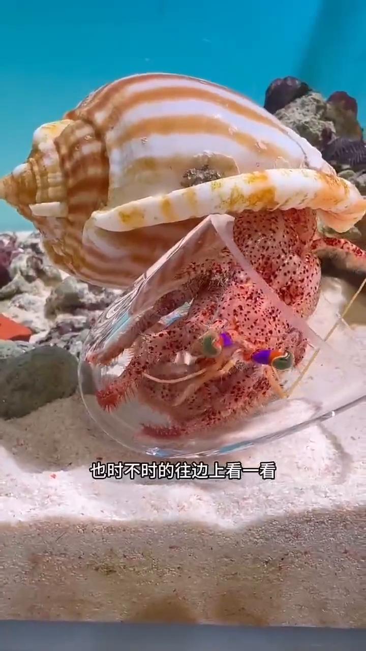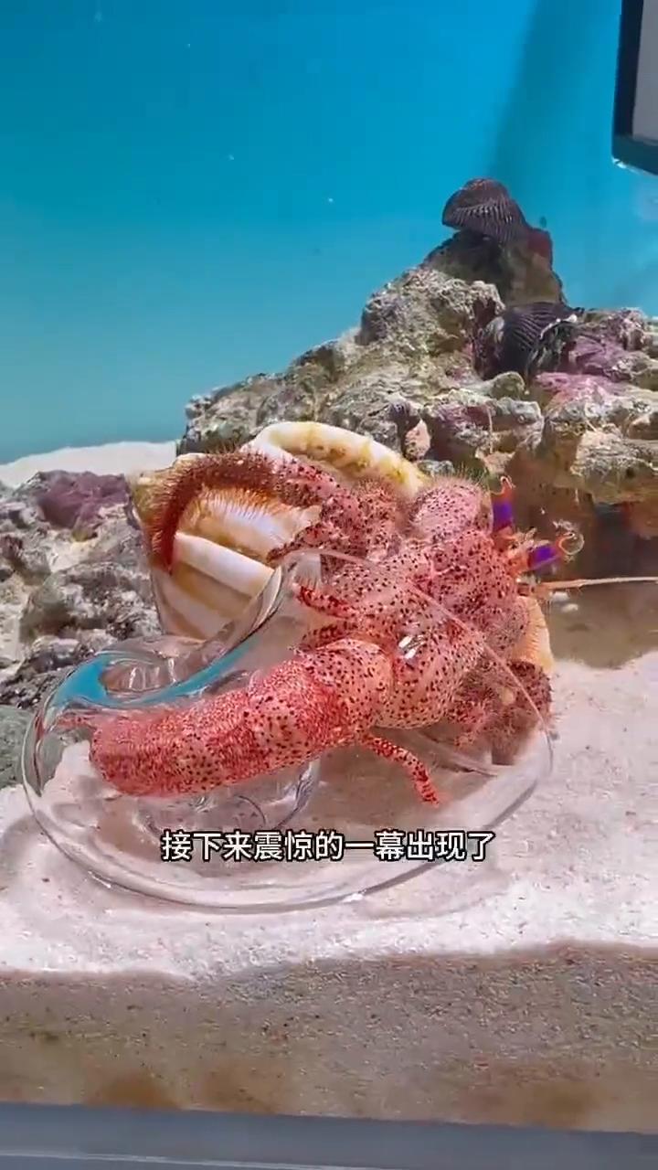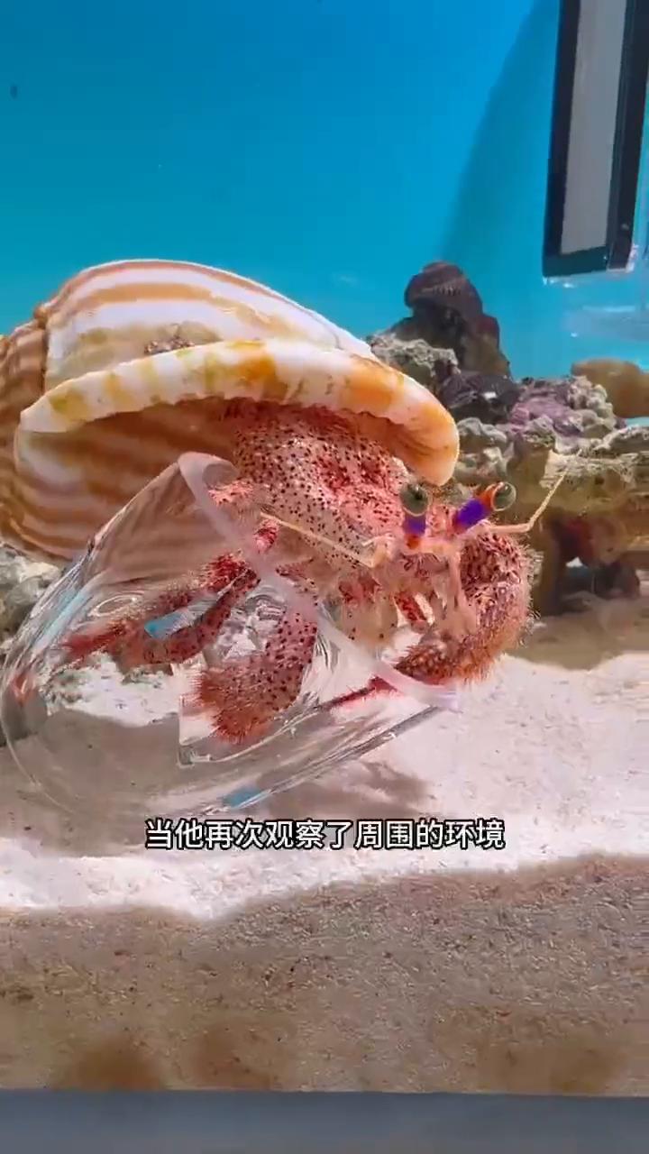 朋友们,今天我竟然拍到了寄居蟹换壳的全过程。自从这只寄居蟹见到这个壳之后就一直没