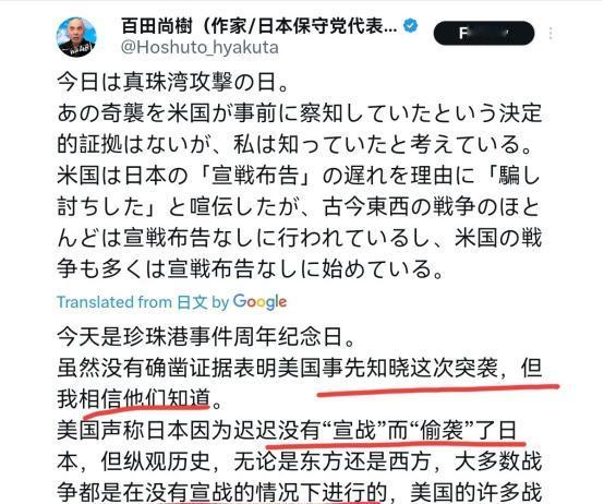 日本开始翻案了!12月8日,日本作家百田尚树公开表示,今天是珍珠港事件纪念日。虽然没有确凿证据证明美国事先察觉了那次奇袭,但我就是觉得他们早就知道了。美国拿日本“宣战公告延迟”当借口,大肆宣扬日本“不宣而战、搞偷袭”,可古今中外的战争大多是没宣战就开打,美国自己发动的战争也好多是不宣而战的。 在东京一家保守派智库的年度论坛上,百田尚树对着镜头调整了三次眼镜,话筒线在他西装前襟缠成松散的结。这位69岁的作家兼政客,正用刻意放慢的语速,将矛头指向82年前的那场军事灾难。 他所在的“日本保守党”自2023年成立以来,始终将“修正战后历史观”作为核心纲领,而珍珠港事件——这个被美国定义为“无耻偷袭”的标志性事件,成了他们撬动历史叙事的支点。 为什么偏偏选在12月8日?这个被日本右翼私下称为“唤醒之日”的特殊节点,藏着怎样的政治算计?要知道,就在上个月,保守党在东京都议会补选中刚刚失利,急需一个话题重新激活支持者。 百田反复强调“美国可能事先知情”,从太平洋舰队航母集体出海,到雷达站误判机群身份,每个细节都被他揉进“阴谋论”的框架。但他绝口不提一个关键事实:1941年12月7日东京发出的最后通牒,内容并非宣战,而是终止美日谈判的普通照会。 有人说这不过是过气作家的个人炒作,毕竟百田近年出版的书籍销量持续下滑,社交媒体粉丝量甚至不如新晋网红政客。但翻看他的日程表会发现,过去半年里,他已连续受邀参加5场内阁成员出席的闭门会议。 这种“先动手再补票”的战术,在日本近代史上并非孤例。1894年甲午战争,日本联合舰队在丰岛海面突袭清军运兵船“高升号”,事后才向清政府递交宣战书;1904年日俄战争,舰队偷袭旅顺港的俄军太平洋分舰队,宣战书迟到了3小时。 百田试图将这种军事传统包装成“高效战术”,却回避了最核心的问题:1907年《海牙公约》第1条明确规定“非经预先警告不得开始敌对行为”,而日本,正是该公约的缔约国。 如果连白纸黑字的国际公约都可以选择性无视,那所谓的“历史真相”,不过是某些人手中可以随意捏塑的橡皮泥? 保守党在去年众议院选举中仅获得3个席位,远低于预期。百田作为党内“历史修正派”代表,急需通过争议性言论扩大影响力——毕竟在日本政坛,“敢对历史说不”历来是右翼博取支持的流量密码。 他狡猾地将话题从“是否违法”偷换成“是否普遍”,就像小偷抱怨失主没锁门,却忘了自己撬锁的动作本身就是犯罪。 短期来看,这番言论已引发韩国外交部的抗议,称“日本右翼正将地区安全推向危险边缘”;长期而言,这种对侵略历史的粉饰,只会让亚洲邻国更加警惕日本军事力量的重新抬头。 82年前珍珠港的硝烟早已散尽,但有些人仍在试图点燃新的历史迷雾。只是他们忘了,历史不是任人打扮的小姑娘,每一次对真相的篡改,都会成为钉在耻辱柱上的新铁钉。