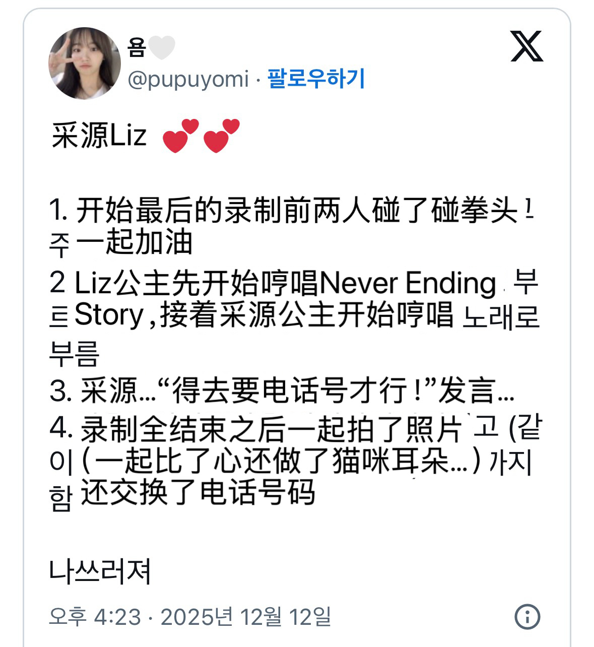 今天进行了歌谣大祝祭合作舞台预录的LE SSERAFIM金采源 x IVE Liz合作歌曲是《Never Ending Story》,两人还交换了电话号码!预录小卡也绝美(采源虽然是个人预录但送了组合的套卡),期待美女们的合作舞台