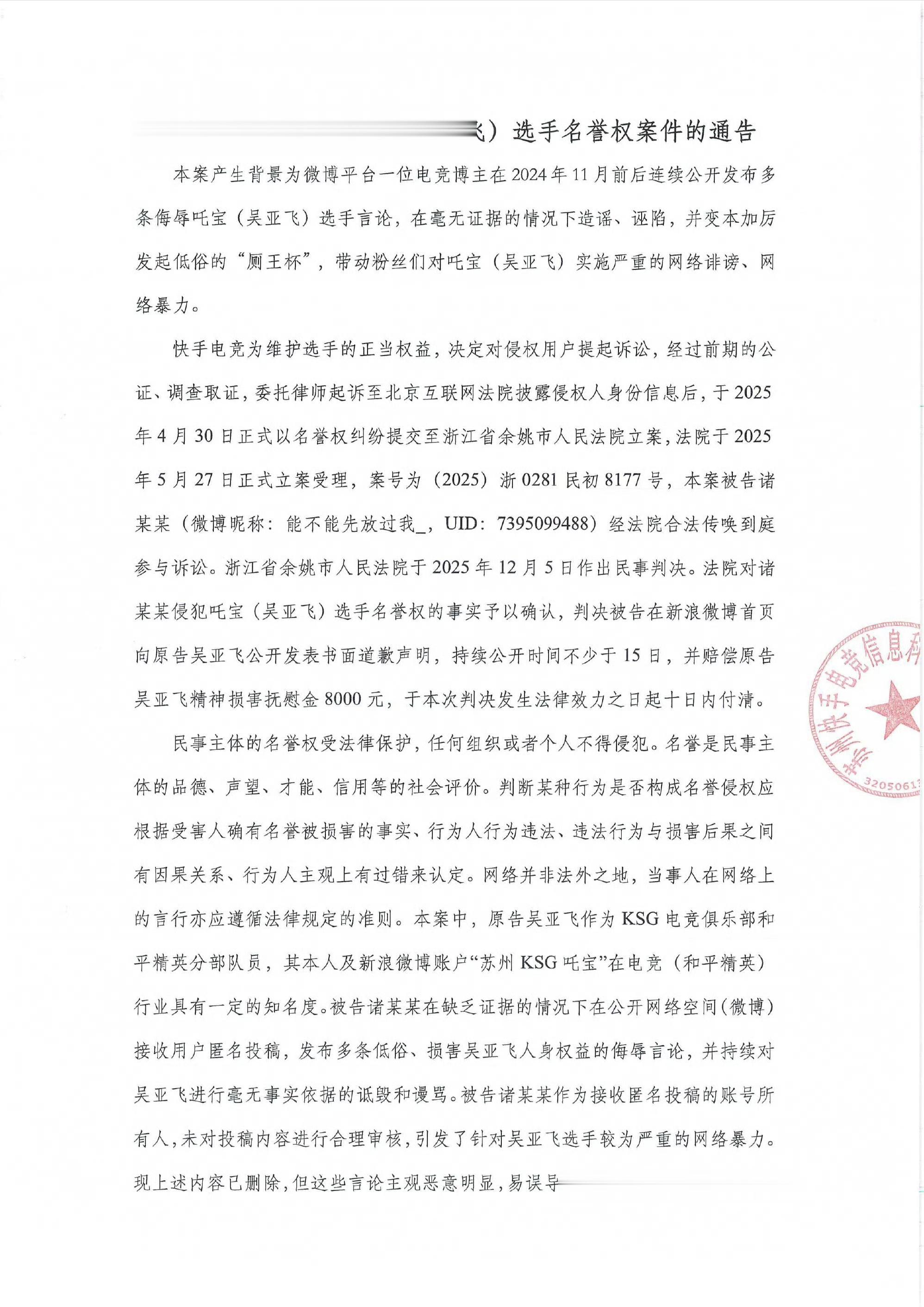 关于苏州KSG选手吒宝(吴亚飞)名誉权案件的进展,说明如下:
