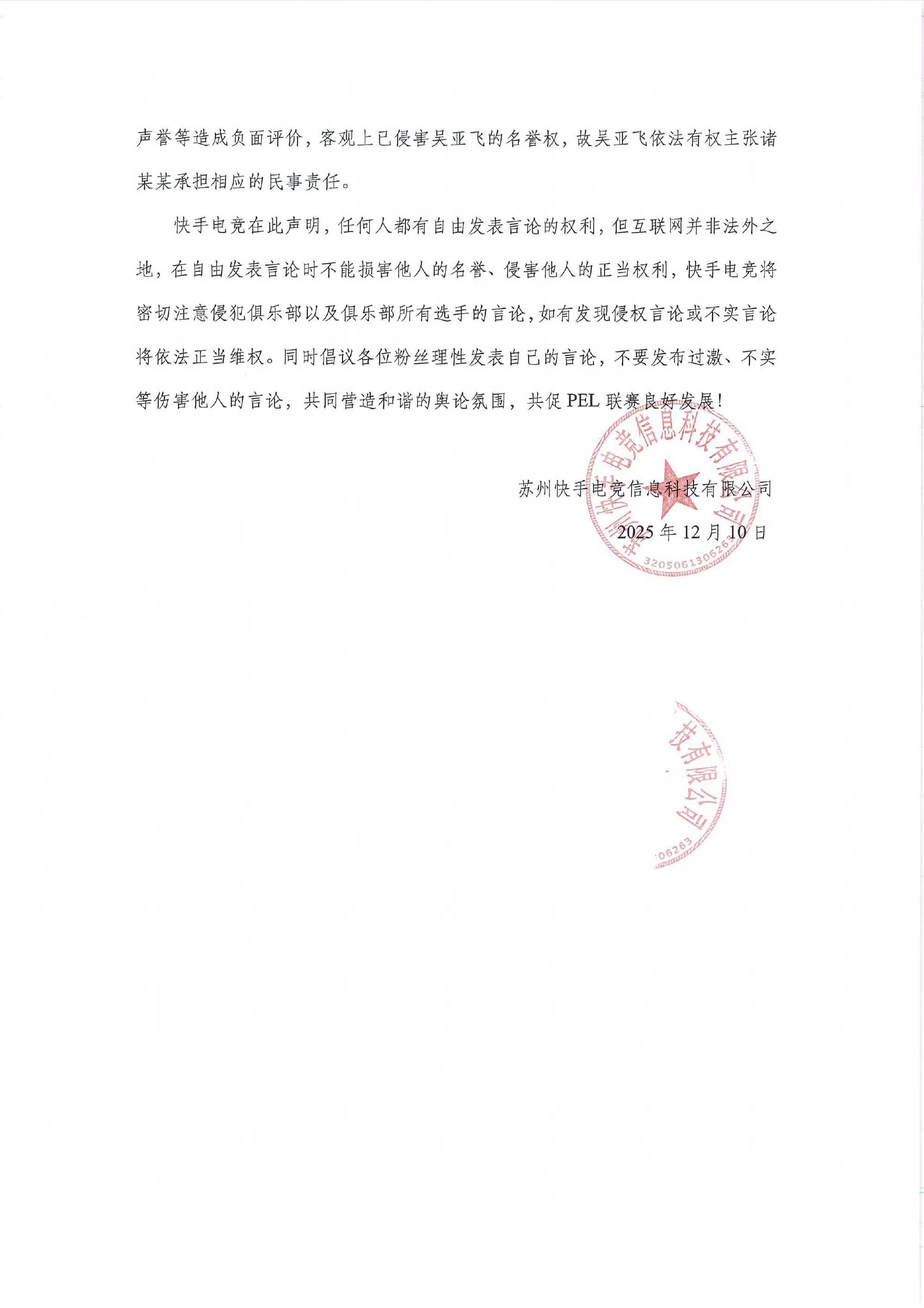 任何人都有自由发表言论的权利,但互联网并非法外之地,造谣诽谤、恶意中伤者终将会为自己的言行负责。快手电竞会积极维护选手的合法权益,长期密切关注网络舆情,对于侵权行为将一告到底,我们说到做到。
