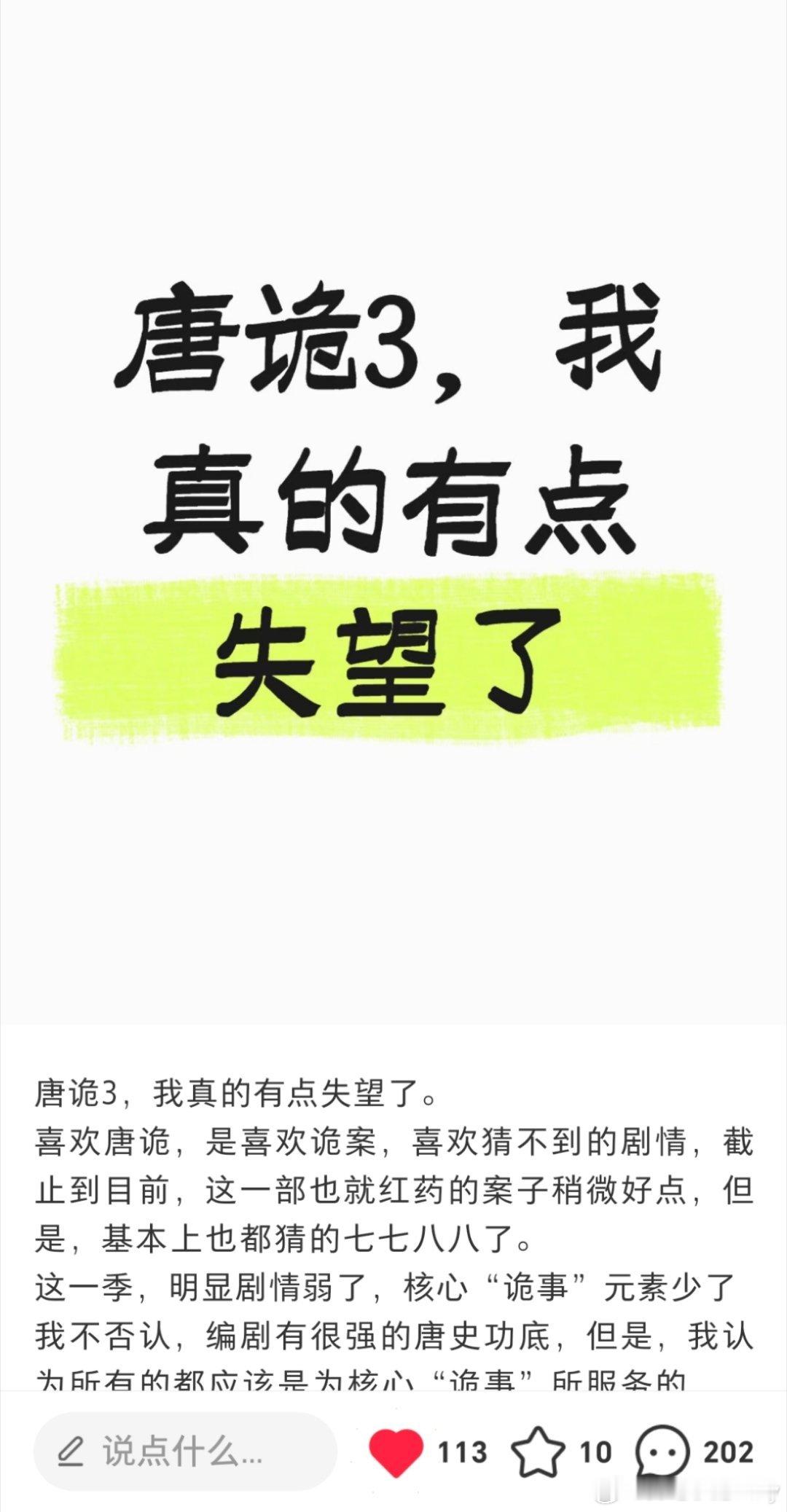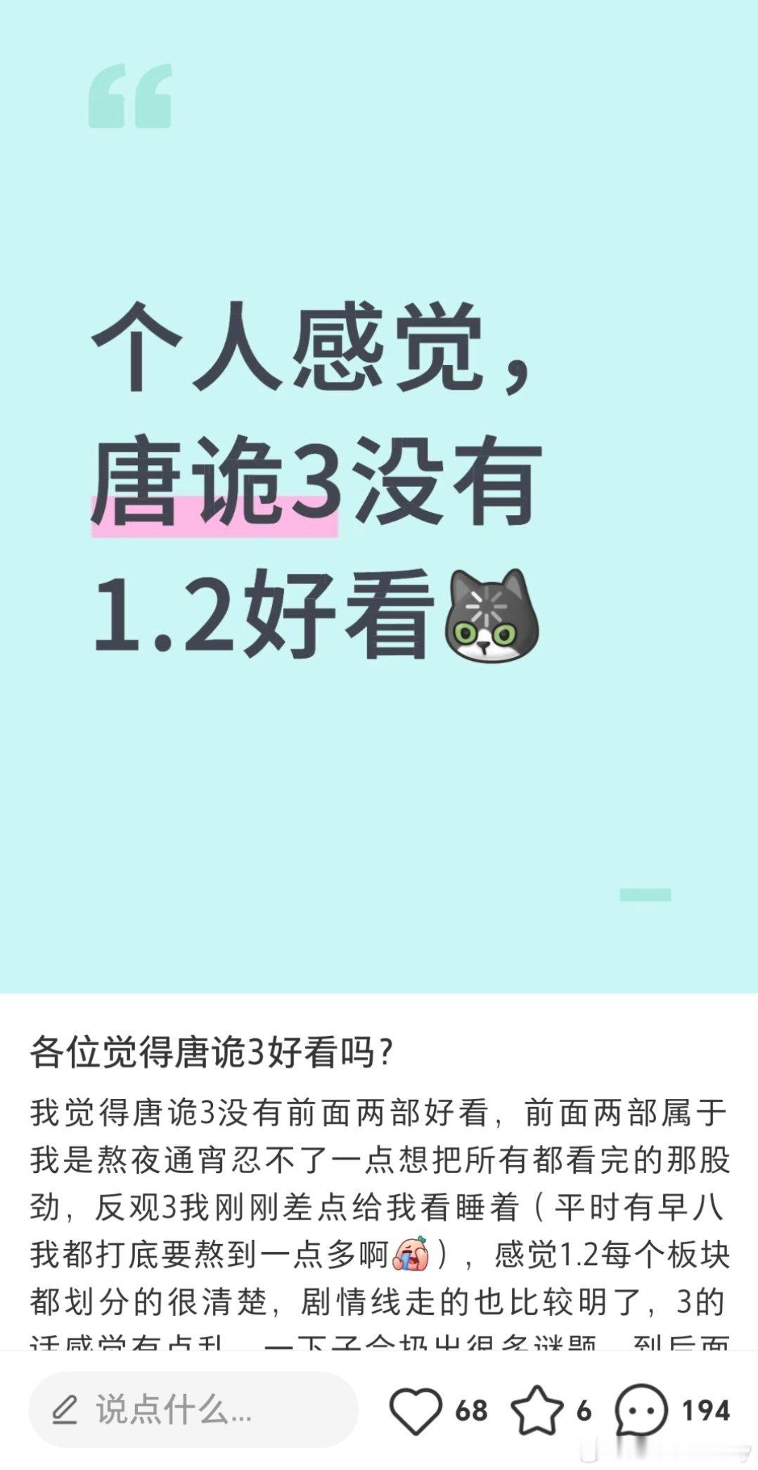 唐诡奇谭定档好家伙,才发现这么多网友也觉得《唐诡3》不好看,其实我看的时候也很失望,故事太过于降智,随便猜都知道结局,强行加一些煽情戏码,完全是把破案剧当古偶拍,所以大家不要对《唐诡奇谭》抱希望了,大概率也没多好看,十有八九会扑!唐诡奇谭