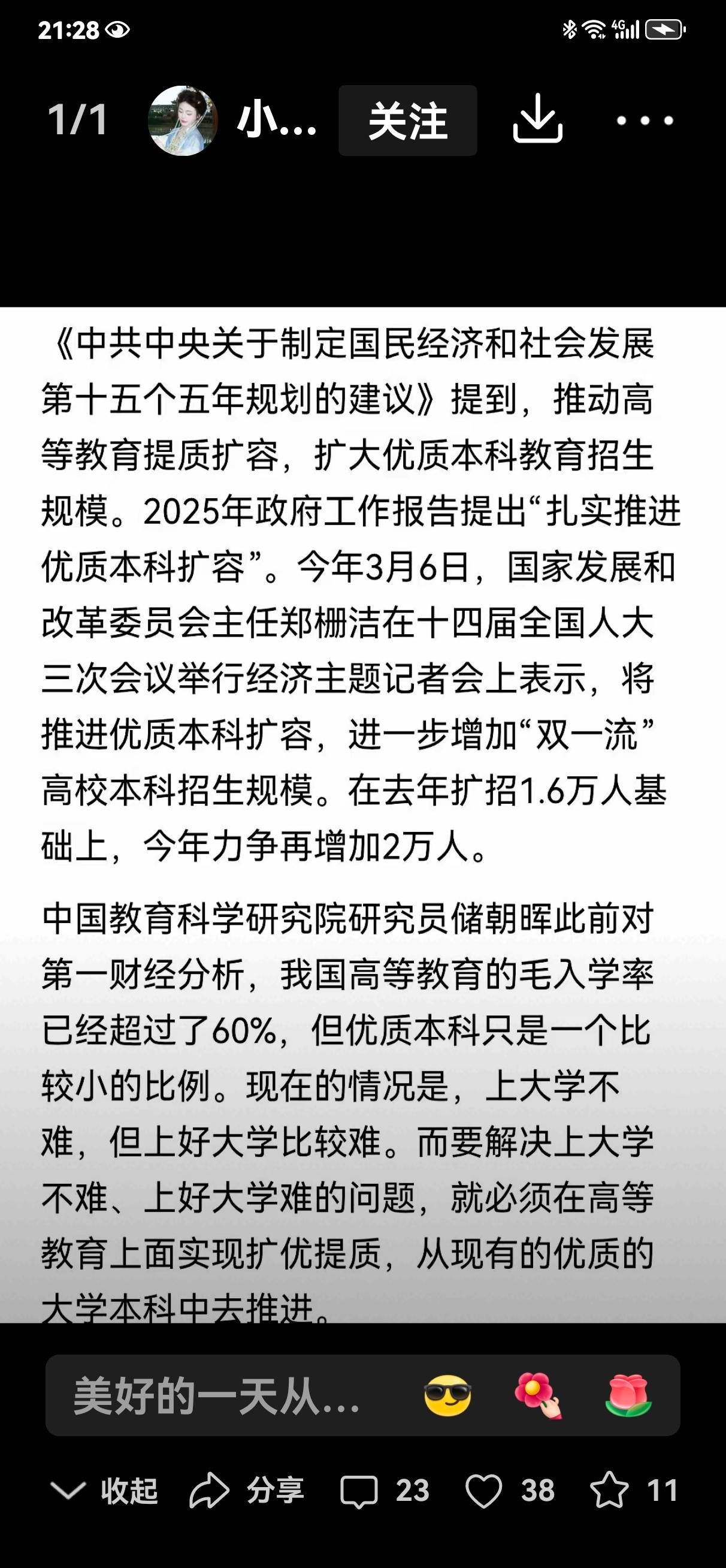 普高要扩招,大学要扩招,硕士博士也要扩招。提高全民素质,减缓就业压力,同时部分高校招生缺人,全面实施义务教育,应该让娃娃全部上普高,然后慢慢分层分流。既然中考化学都不考了,英语是否也应该降低要求,这也是因材施教吧。这样也能缓解一下家长的焦虑,但是就业压力依然巨大,希望国家在这方面加大对应策略。