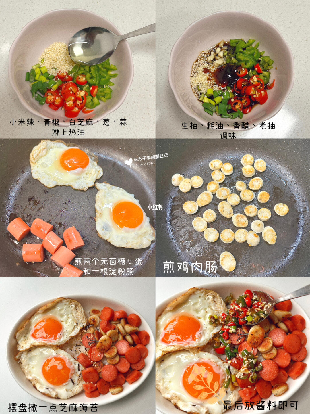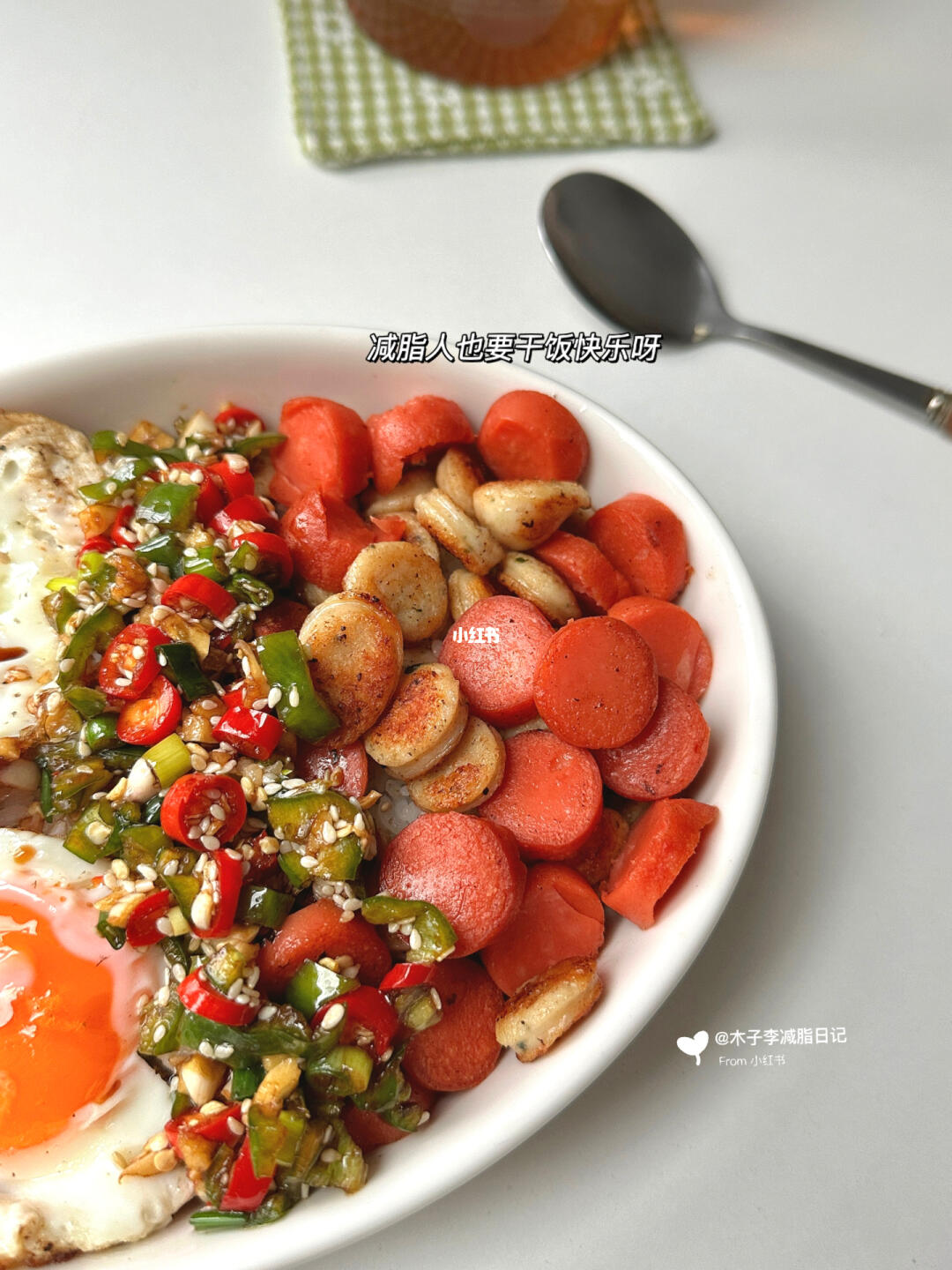 谁还没吃过这碗香肠煎蛋老式拌饭~真太香啦😋 每一口都嘎嘎香、减脂人也要大口干饭!!我们要快乐减肥!吃瘦不饿瘦✌🏻️ : 🍽️食材: 米饭🍚 | 青红椒 | 鸡蛋2个 | 香肠 | 白芝麻 | 蒜末 | 葱 . 🍽️做法: 1.调个酱汁:青红椒➕蒜末➕葱➕白芝麻浇上热油 | 生抽1勺、老抽半勺、耗油1勺 、香醋2勺) 2.鸡肉肠和香肠切片、煎至焦焦的 3.煎连个糖心蛋 4.米饭铺底、摆好鸡蛋、香肠再浇上酱汁即可~ . [米饭🍚可以换成糙米饭、杂粮饭、藜麦饭]简单快手 香辣过瘾一口就沦陷~