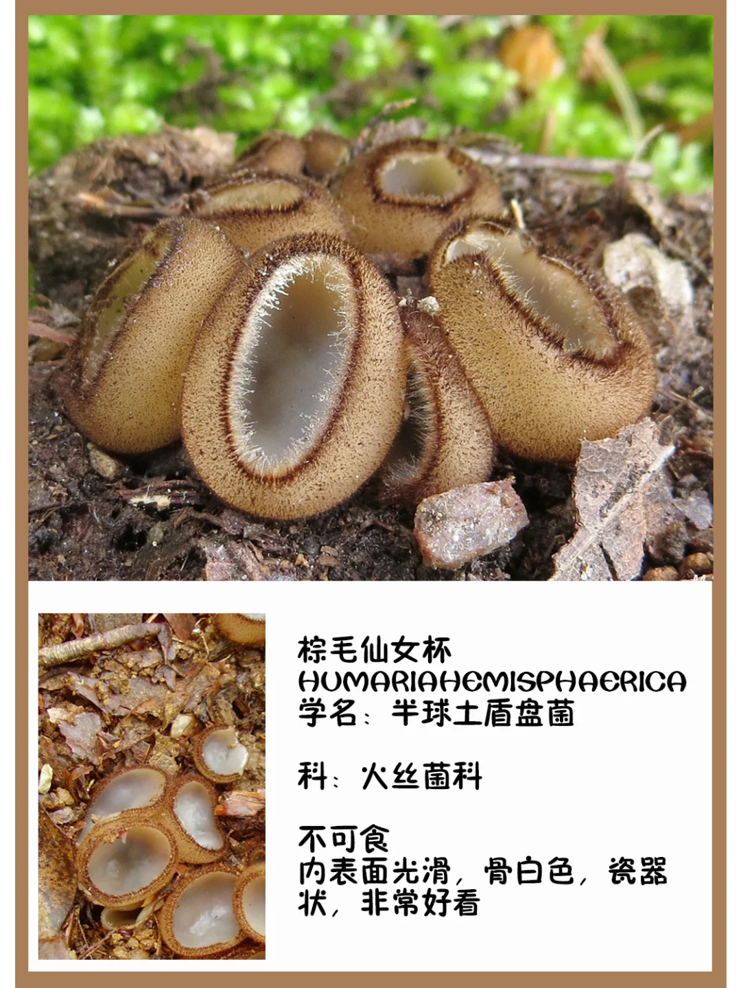 棕毛仙女杯 Humariahemisphaerica 学名:半球土盾盘菌 科:火丝菌科 图片©manatarka.org 不可食 内表面光滑,骨白色,瓷器状,非常好看[害羞R]
