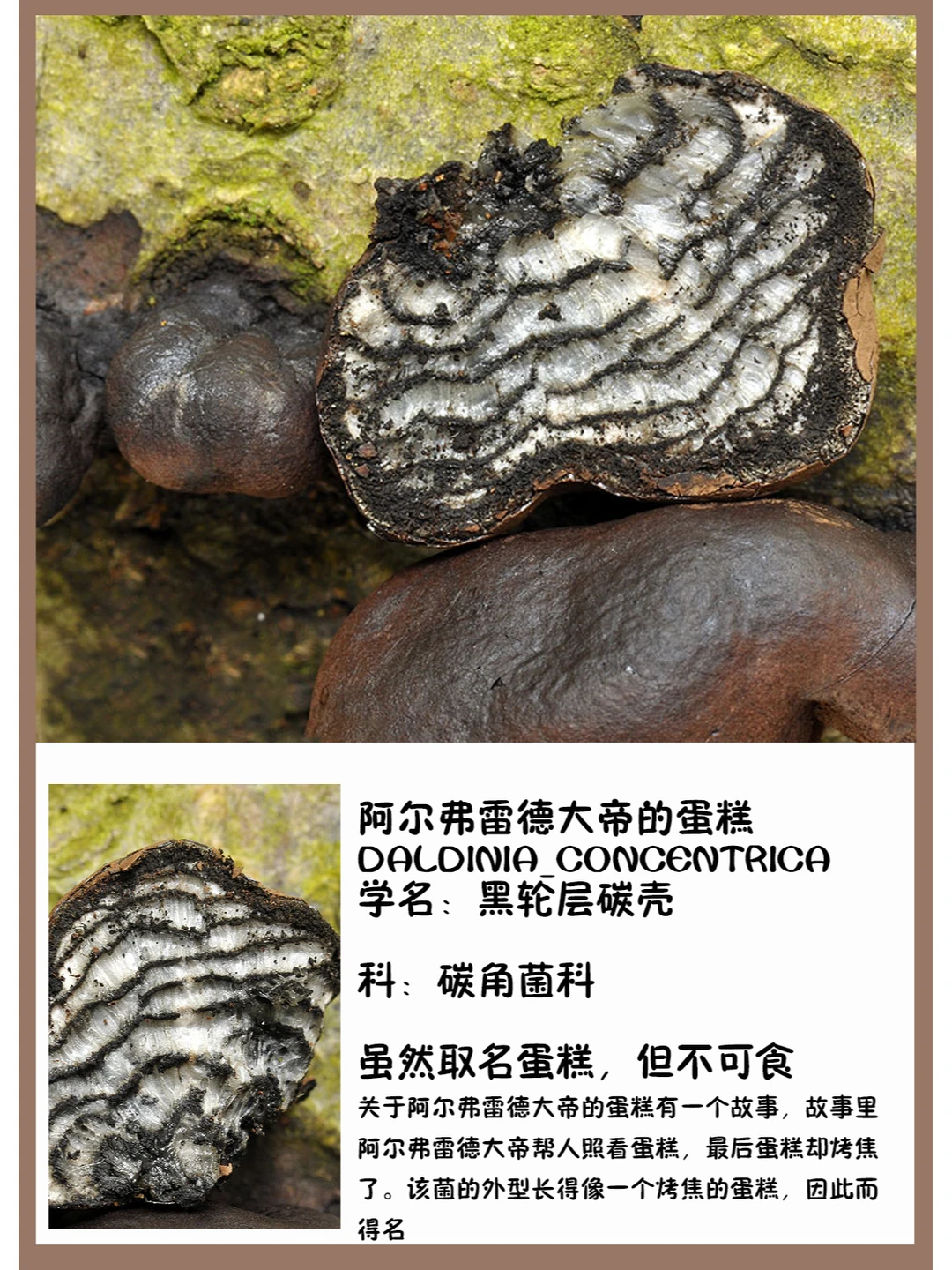 阿尔弗雷德大帝的蛋糕 daldinia_concentrica 学名:黑轮层碳壳 科:碳角菌科 图片©manatarka.org ©josef hlasek 虽然取名蛋糕,但不可食 关于阿尔弗雷德大帝的蛋糕有一个故事,故事里阿尔弗雷德大帝帮人照看蛋糕,最后蛋糕却烤焦了[doge] 该菌的外型长得像一个烤焦的蛋糕,因此而得名