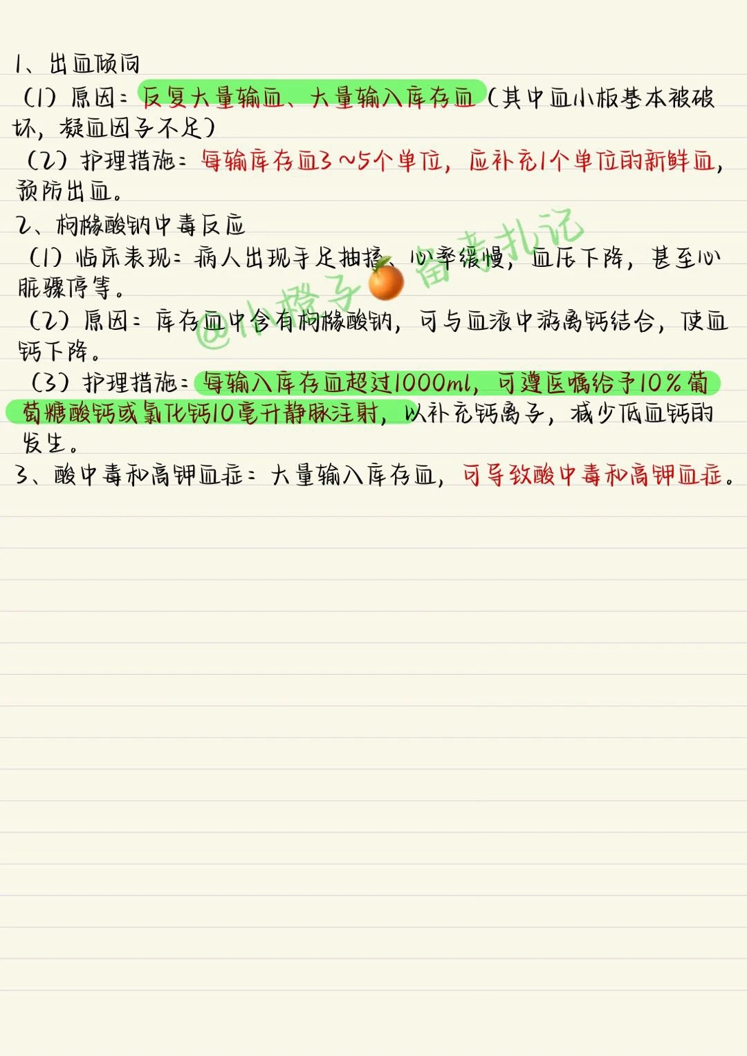 4⃣️大量输血后反应:出血倾向;枸橼酸钠中毒反应;酸中毒和高钾血症