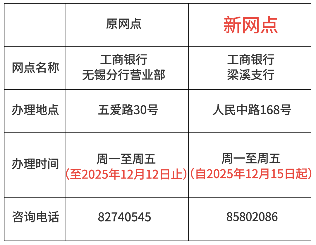 为打造公积金业务一站式便民服务网点,更好地服务住房公积金缴存职工,自2025年12月15日起,工商银行无锡分行营业部将所有承办的公积金业务(包括公积金汇缴、提取、贷款及住房置业担保业务)迁至工商银行梁溪支行(地址:无锡市人民中路168号)办理,咨询电话变更为0510-85802086。已签订住房公积金小额托收协议的单位不受影响。由此给您造成的不便,敬请谅解。