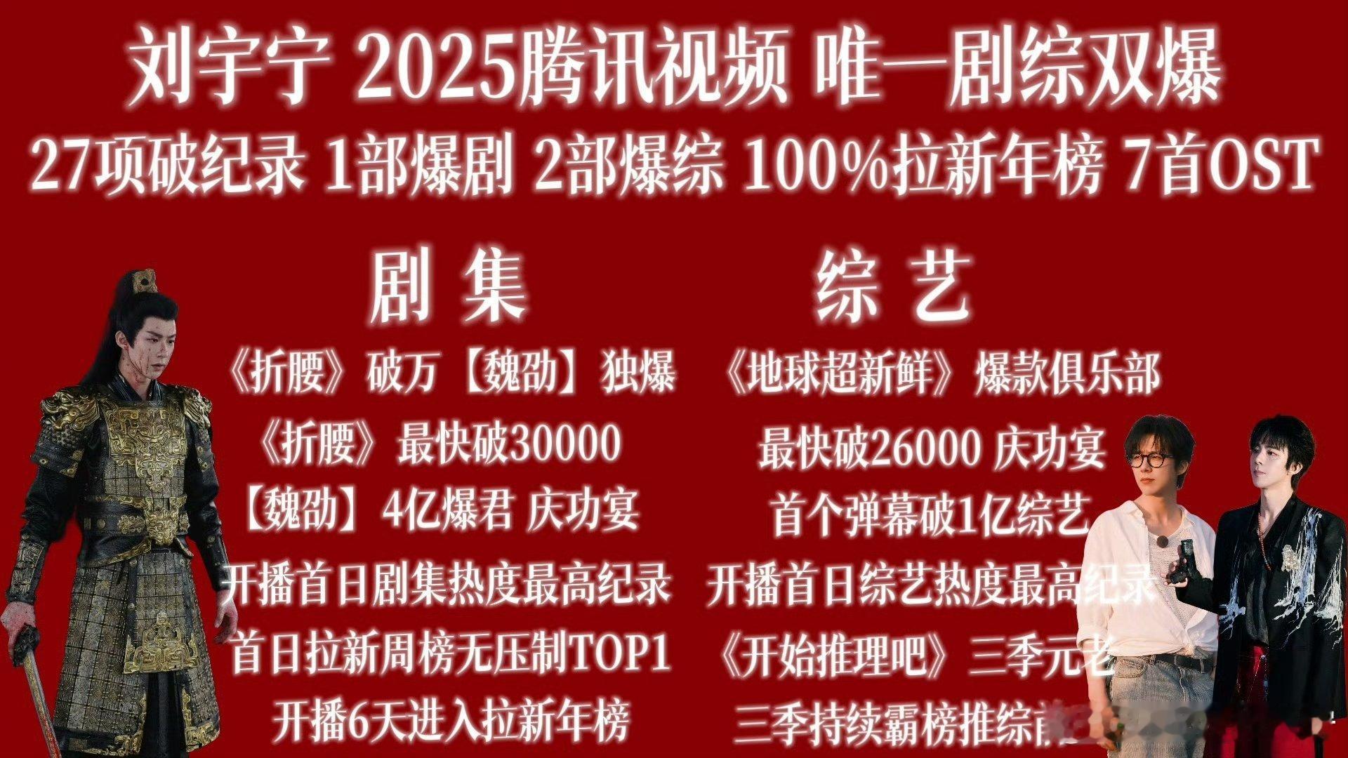 摩登兄弟 | 刘宇宁音乐演出剧集综艺都有入围刘宇宁在2025年凭借音乐、演出、剧集、综艺等领域的9部作品横扫2025微博之夜五大核心赛道, 而卷王本王却自谦收获“一丢丢肯定”!主演剧集屡破记录,实打实三平台破万男主;演唱的OST获央媒认证“主流标杆”;二巡演唱会场场秒罄,演唱会变高定秀场;四档常驻综艺节目,无论是推理类、文旅类、还是音综,表现亮眼,获评“综艺感拉满”。就这个内娱唯一全赛道通吃的多栖多顶艺人的含金量仍在上升刘宇宁全赛道通吃 | 刘宇宁站起来一个双开门冰箱立在那 | 刘宇宁星光值TOP2 | 刘宇宁星光大赏 | 刘宇宁