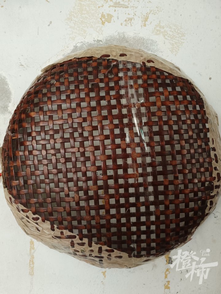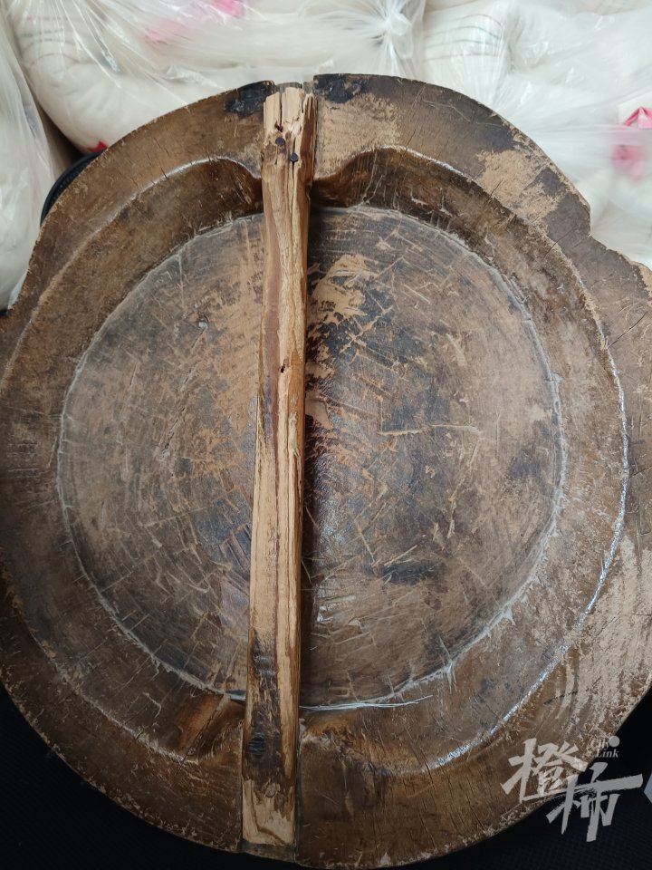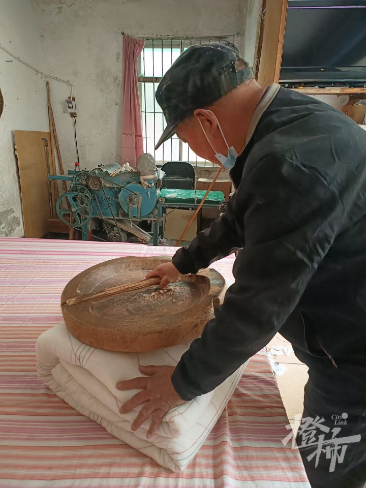 “做棉被首先要弹棉花,手工弹一床要一个多小时,现在有了弹花机快了很多,弹一床只要十来分钟,第二步铺棉纱叠棉花,再用‘花压’压棉花裹棉纱,需要半个小时,最后用磨盘磨压,棉被正反面都得磨过,磨压我先用手动磨盘,再用电动磨盘,最后再用手动磨盘,也要半个小时。我的‘手动磨盘’已经传了4代人,是师傅的爷爷手上做的传给了我,‘弹花弓’也用了50多年,师傅用了10多年后传给我的,‘花压’也是师傅传下来的,没得买也没替代品,有破损就用胶带粘。