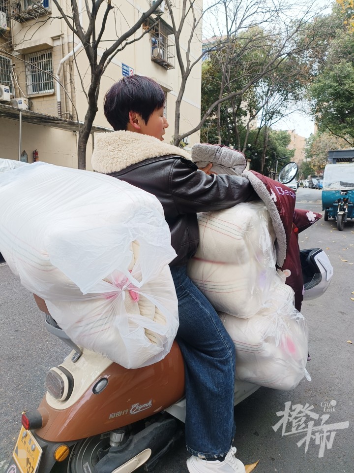 45岁的杨女士下午来拿翻新好的棉被。杨女士说,这次把放了15年没用过的结婚棉被和孩子以前读幼儿园的棉被拿来翻新,婚被一床9斤,一床10斤,太重了,翻新成3床1米8乘2米的棉被。“这次旧棉被翻新花了285元,总是比扔扔掉划算的,我在旁边上班,先拿到单位,晚点老公会来拉回去。”杨大姐骑电瓶车开开心心地拉走了3床棉被。