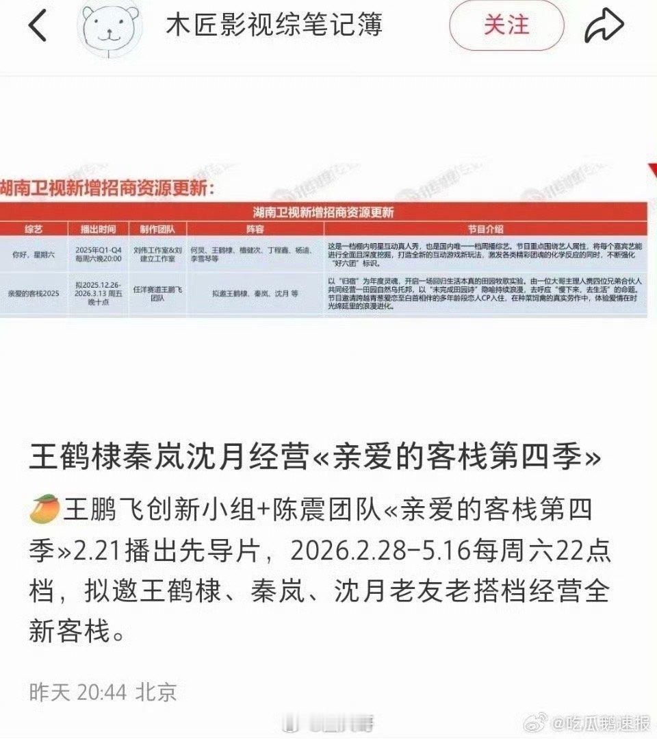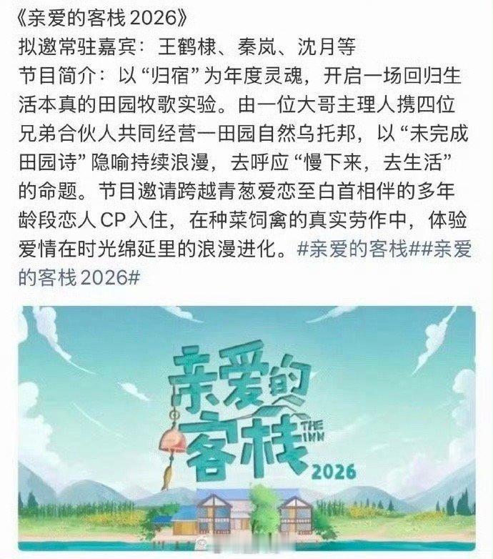亲爱的客栈2026拟邀嘉宾《亲爱的客栈2026》终于要来了,没想到这一季的常驻嘉宾居然是王鹤棣啊,另一位常驻嘉宾将和王鹤棣成为“青春合伙人”,网友猜测大概率是沈月。棣月系复合,谁懂这个阵容的含金量啊~网传王鹤棣将常驻亲爱的客栈2026